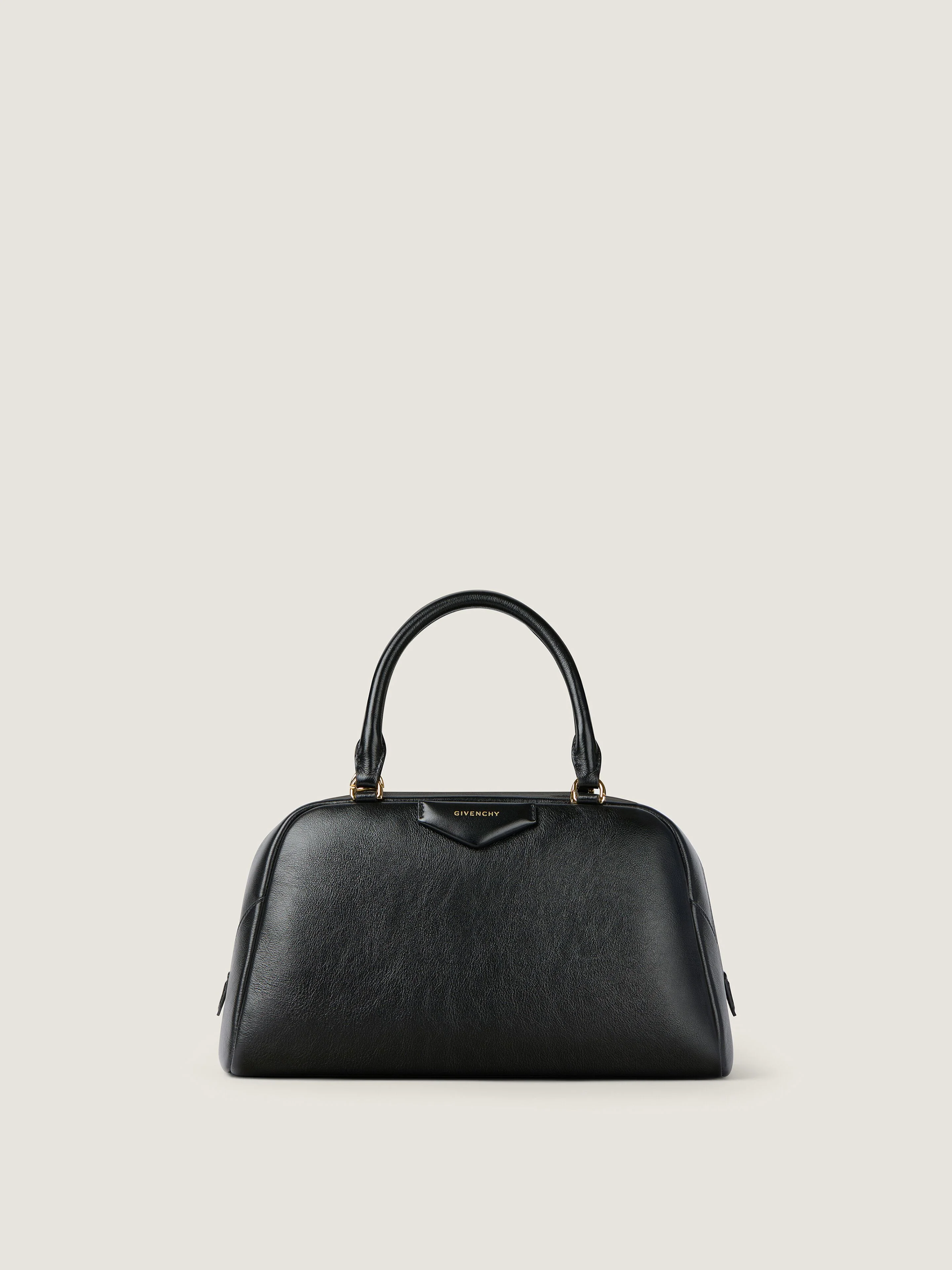- Medium bag in grained calfskin leather. - Antigona line. - Long East-West shape with origami-style gusset construction. - Zipped closure. - Hand, shoulder or crossbody carrying. - Articulated leather handles with four D-Rings for the shoulder strap. - Adjustable and removable leather shoulder strap. - Pentagonal patch with embossed GIVENCHY signature on the front. - GIVENCHY Paris patch on the inside. - Golden-finish metal details. - One main compartment with one flat pocket inside. - Cotton lining.