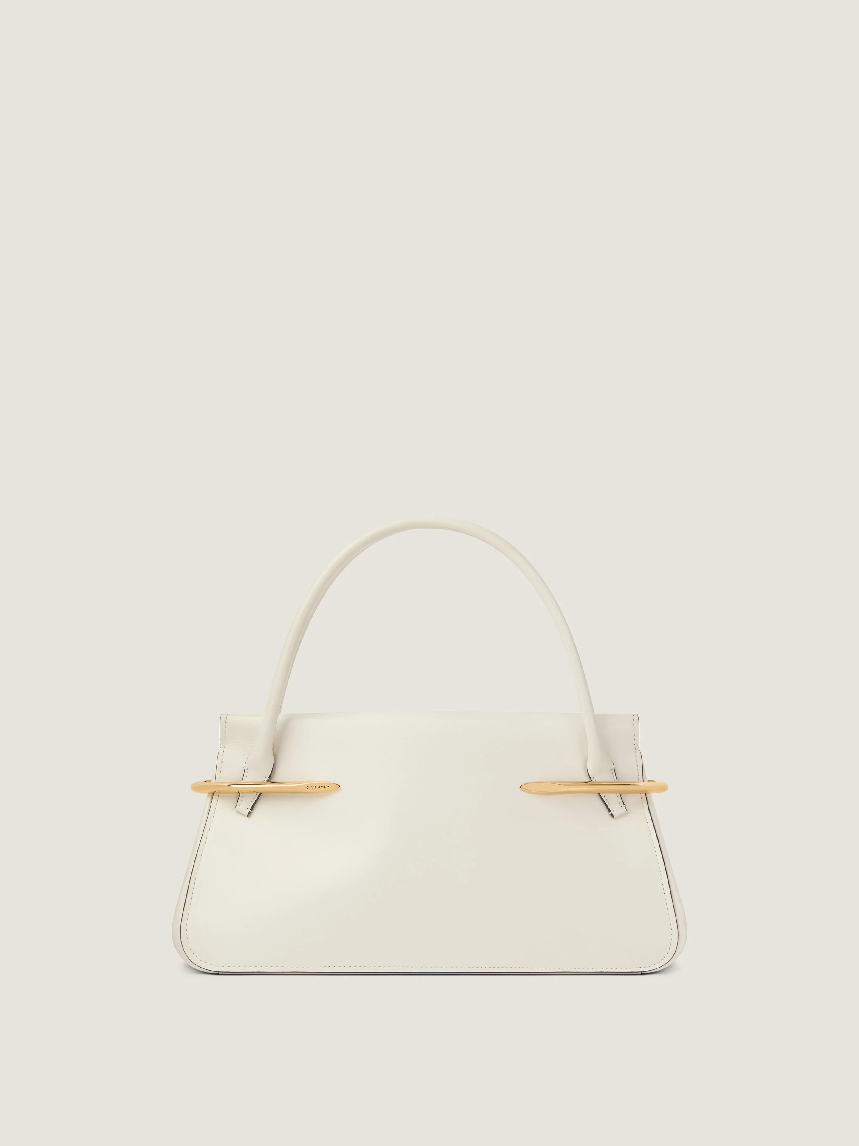 - Medium handbag in leather with natural grain and textured finishing. - Pinch line. - Magnetic closure. - Leather handles for hand carrying and non adjustable strap with GIVENCHY embossed offering shoulder carrying. - Golden-finish metal pinches with GIVENCHY engraved. - GIVENCHY Paris signature inside. - Contrasted hand made edges. - One main compartment with one flat pocket inside. - Inside mirror. - Metal base feet. - Nappa lining.