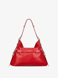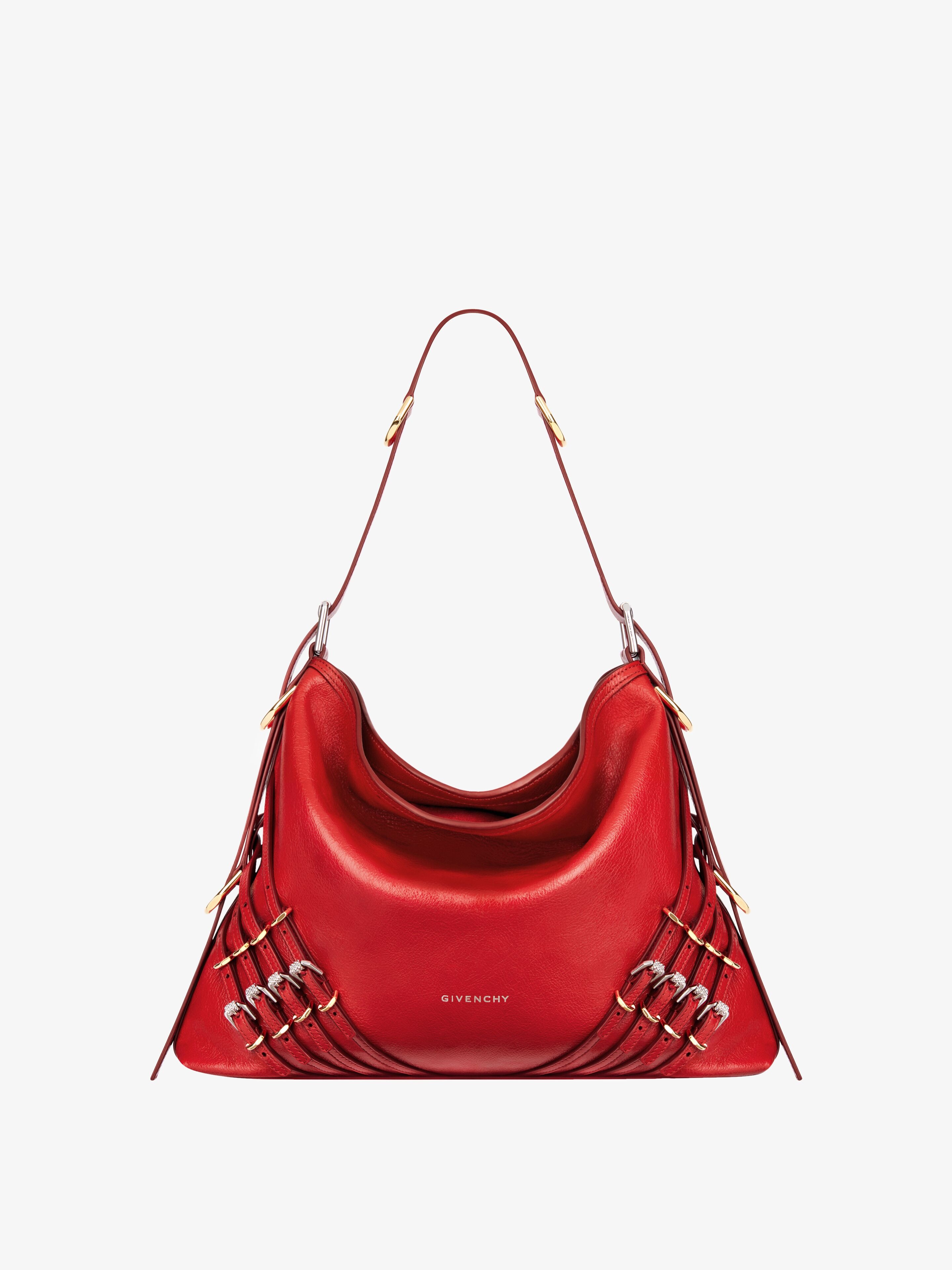- Medium shoulder bag in tumbled buffalo leather. - Voyou line. - V-shaped slouchy silhouette. - Adjustable shoulder strap offering hand, shoulder or crossbody carrying. - GIVENCHY signature embossed on the front of the bag and on the top of the shoulder strap. - GIVENCHY engraved metal multi-buckles. - Golden and silvery-finish metal details. - One main compartment and one zipped pocket inside.