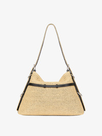 - Medium shoulder bag in raffia and leather. - Voyou line. - V-shaped slouchy silhouette. - Adjustable leather and raffia shoulder strap offering hand, shoulder or crossbody carrying. - Metal GIVENCHY signature on the front of the bag and embossed on the top of the shoulder strap. - GIVENCHY engraved metal buckles. - Silvery-finish metal details. - One main compartment and one zipped pocket inside. - Adjustable shoulder strap length from 11.4 to 39.8 in. - Minimal drop : 6.3 in and maximal drop : 21.2 in.
