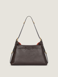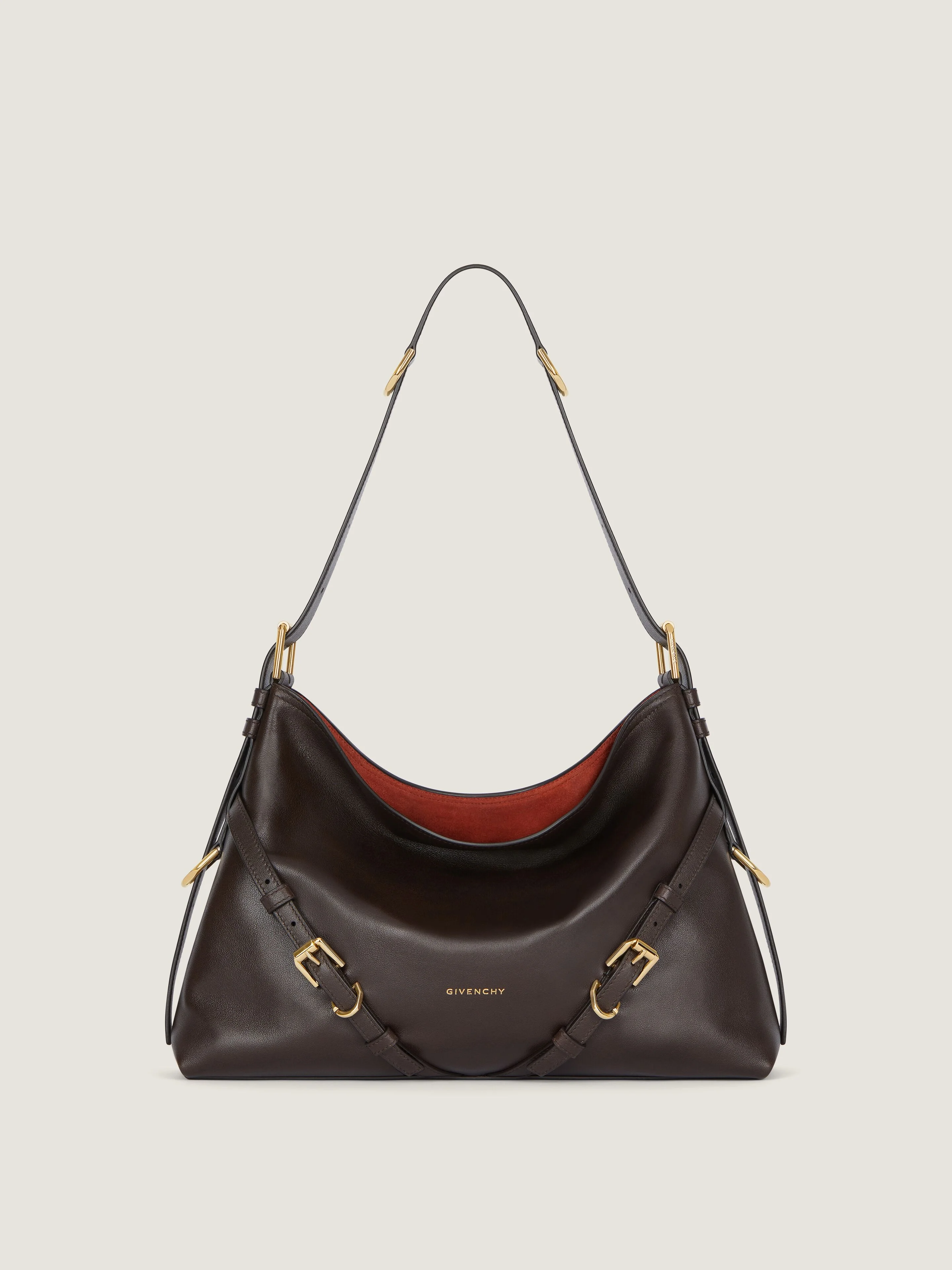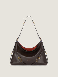 - Medium shoulder bag in elevated smooth and shiny calfskin leather. - Voyou line. - V-shaped slouchy silhouette and generous volume. - Adjustable shoulder strap offering hand, shoulder or crossbody carrying. - GIVENCHY signature embossed on the front of the bag and on the top of the shoulder bag. - Delicate GIVENCHY engraved metal buckles. - Golden-finish metal details. - One main compartment and one zipped pocket inside. - Suede lining.