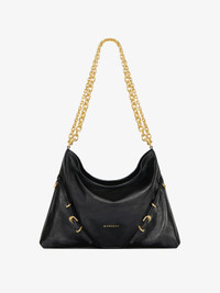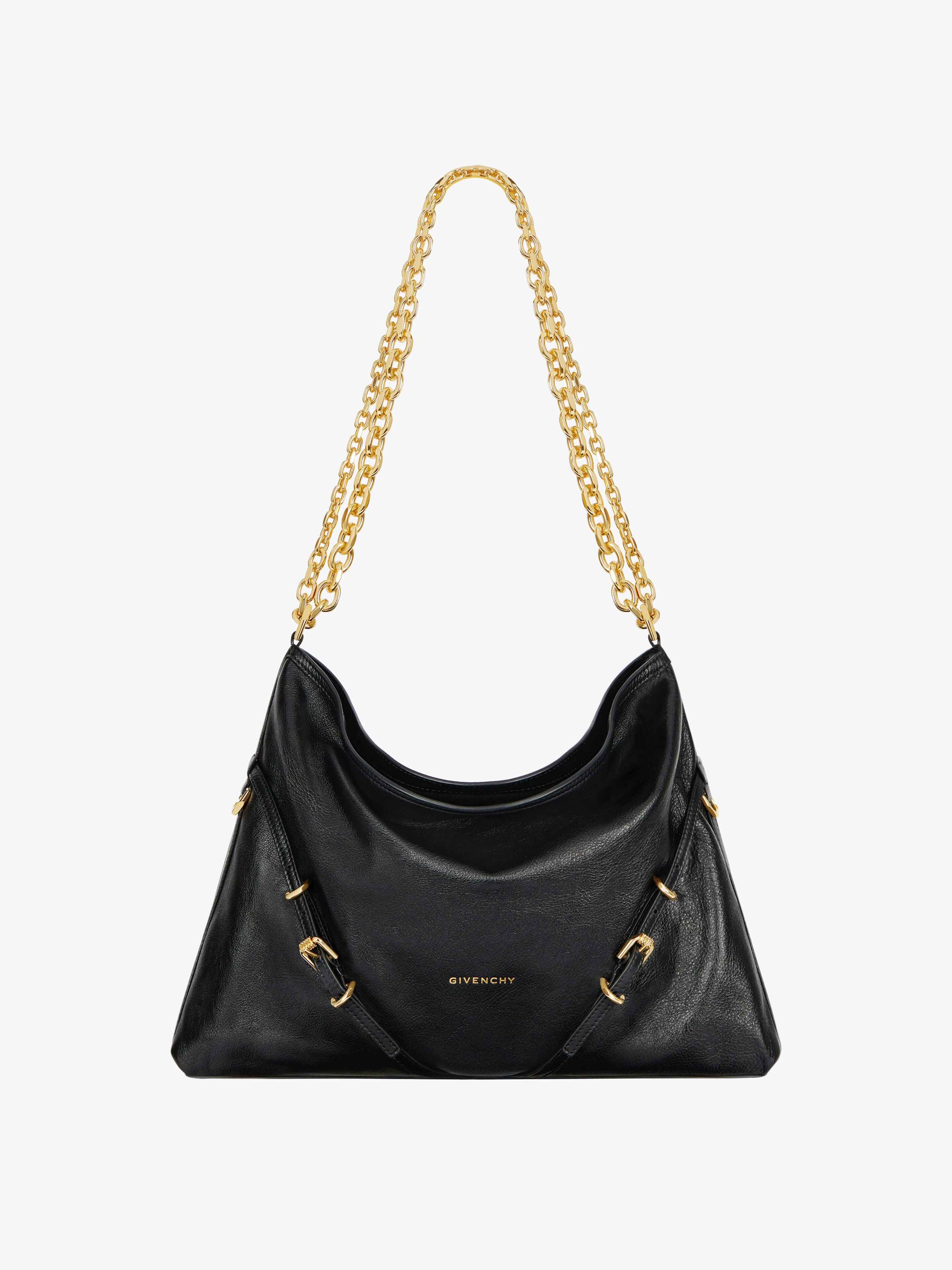 - Medium shoulder bag in tumbled calfskin leather. - Voyou line. - V-shaped slouchy silhouette. - Sliding metal chain with gradient effect offering shoulder or crossbody carrying. - GIVENCHY signature embossed on the front of the bag. - GIVENCHY engraved metal buckles. - Golden-finish metal details. - One main compartment and one zipped pocket inside.