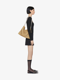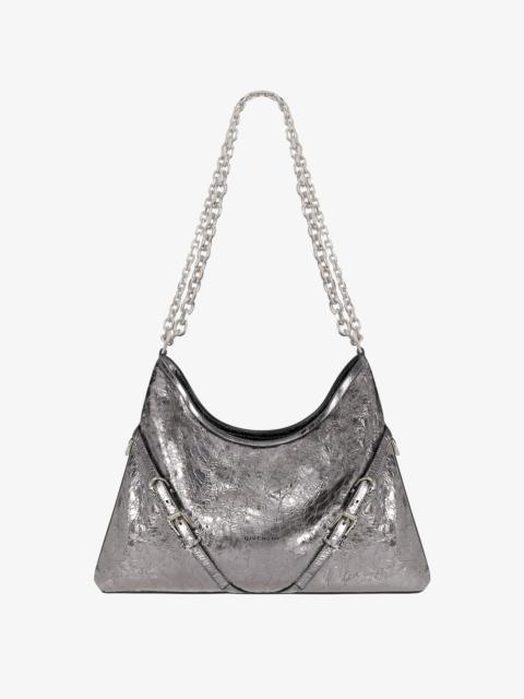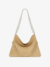 - Medium shoulder bag in suede leather. - Voyou line. - V-shaped slouchy silhouette. - Sliding metal chain with gradient effect offering shoulder or crossbody carrying. - GIVENCHY signature embossed on the front of the bag. - GIVENCHY engraved metal buckles. - Silvery-finish metal details. - One main compartment and one zipped pocket inside.