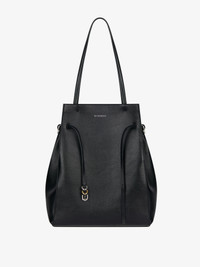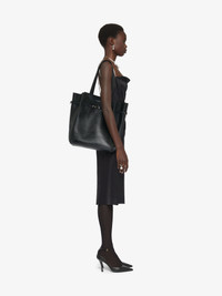 - Medium tote bag in tumbled calfskin leather. - Voyou line. - Long leather handles offering shoulder or hand carrying. - GIVENCHY signature embossed on the front of the bag. - Adjustable leather strap with GIVENCHY engraved metal buckles on the front. - Golden and silvery-finish metal details. - One main compartment. - Suede lining. - Drop: 10.2 in.