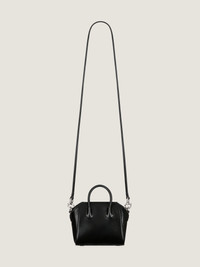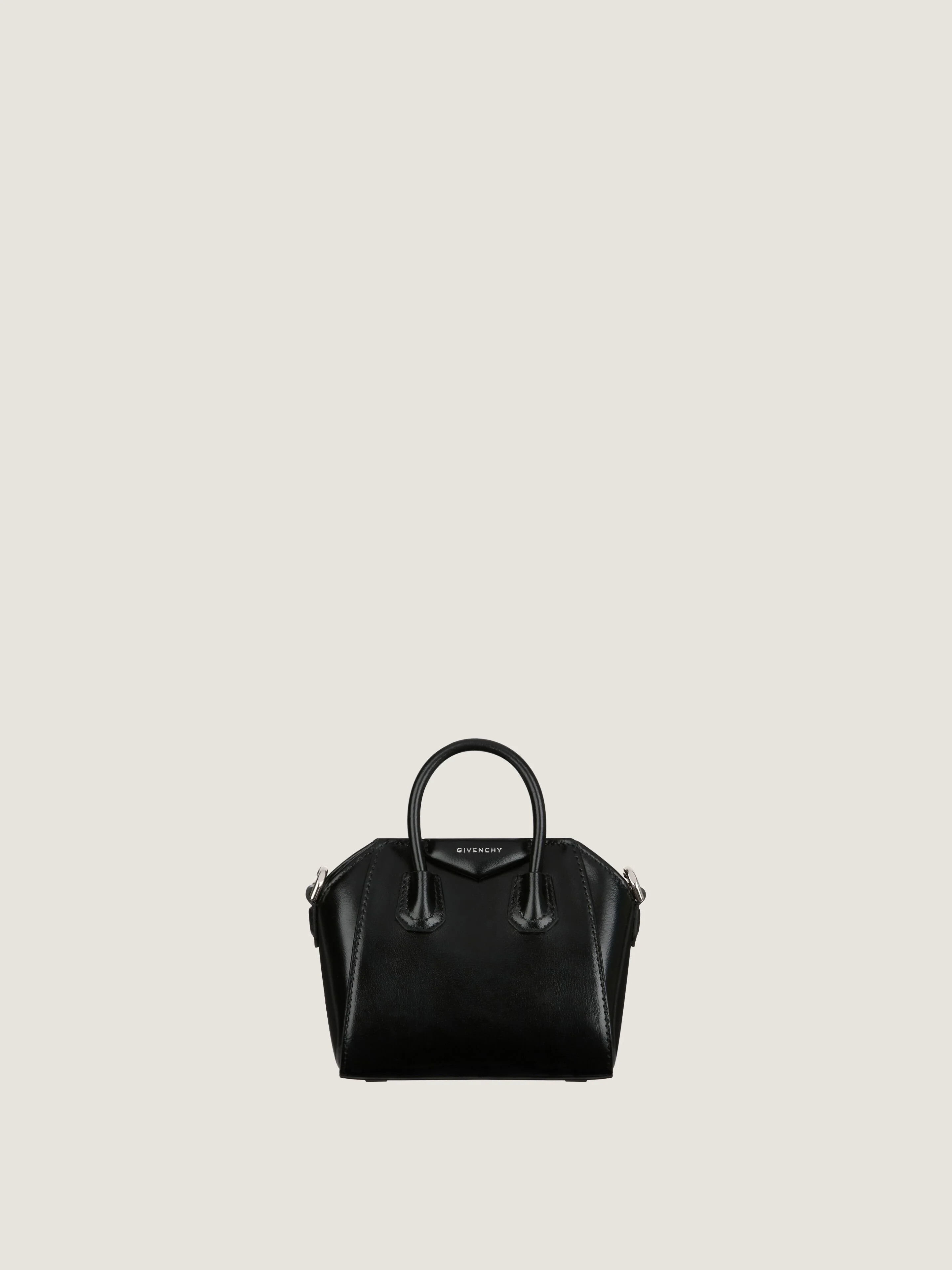 - Micro handbag or crossbody bag in smooth Box calfskin leather. - Antigona line. - Magnetic closure. - Pentagonal patch with silvery-finish GIVENCHY signature. - Removable leather shoulder strap. - Silvery-finish metal details. - One main compartment.
