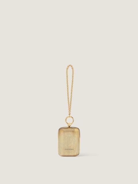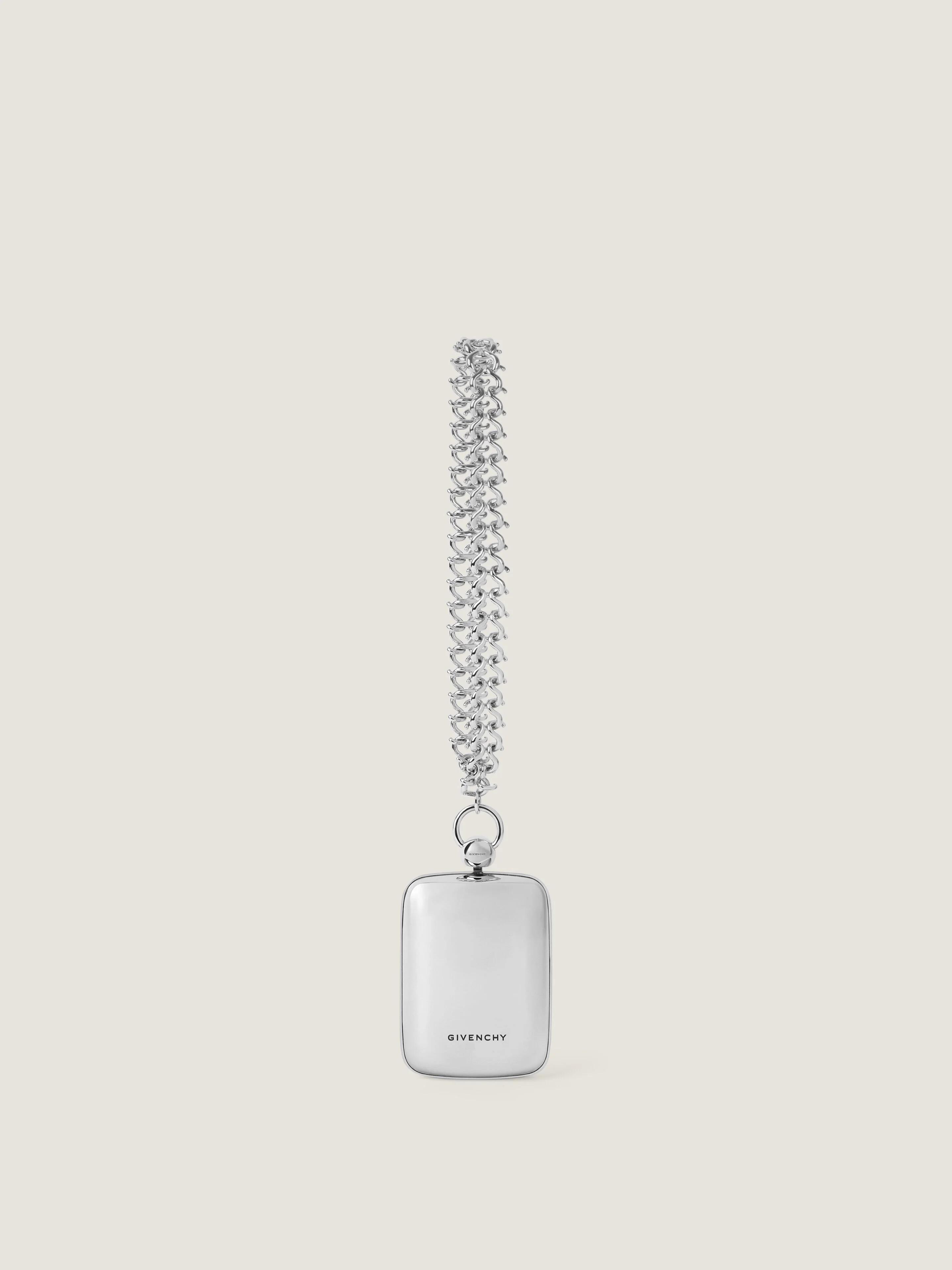 - Micro evening clutch in silvery-finish metal. - Functional metal hinge. - Maxi link chain strap in metal. - GIVENCHY Paris signature on the front and embossed on the inside. - Silvery-finish metal details. - Leather inside gussets. - One card slot inside. - Nappa lining. - Fits small essentials like a cardholder and a lipstick.