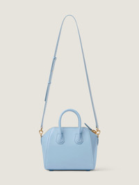 - Mini bag in Box calfskin leather. - Antigona line. - Zipped closure. - Hand or crossbody carrying. - Leather handles. - Adjustable and removable leather shoulder strap. - Pentagonal patch with golden embossed GIVENCHY signature. - Golden-finish metal details. - One main compartment with two flat pockets and one zippered pocket inside.