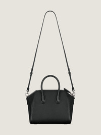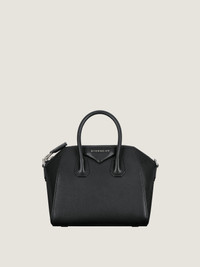 - Mini handbag or crossbody bag in grained goatskin leather. - Antigona line. - Zipper closure with GIVENCHY 4G zipper pull. - Pentagonal patch with silvery debossed GIVENCHY signature. - Leather handles. - Adjustable and removable strap in leather. - Silvery-finish metal details. - One zippered pocket inside. - Handle: 3 in.