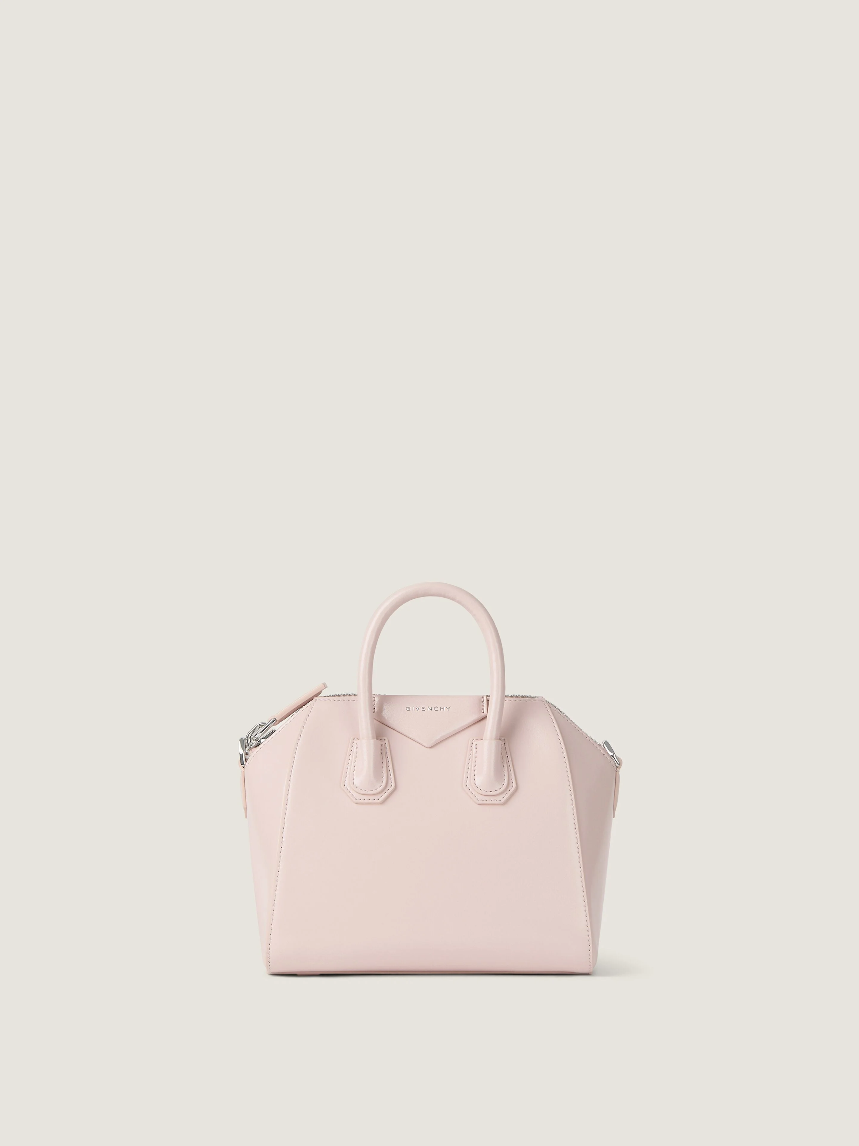 - Mini bag in Box calfskin leather. - Antigona line. - Zipped closure. - Hand or crossbody carrying. - Leather handles. - Adjustable and removable leather shoulder strap. - Pentagonal patch with silvery embossed Givenchy signature. - Silvery-finish metal details. - One main compartment with two flat pockets and one zippered pocket inside.