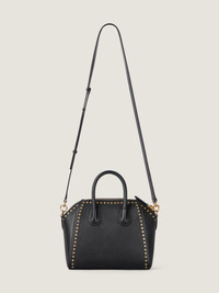 - Mini bag in Box calfskin leather with studs. - Antigona line. - Zipped closure. - Hand or crossbody carrying. - Leather handles. - Adjustable and removable leather shoulder strap. - Pentagonal patch with golden embossed GIVENCHY signature. - Golden-finish metal details. - One main compartment with two flat pockets and one zippered pocket inside.