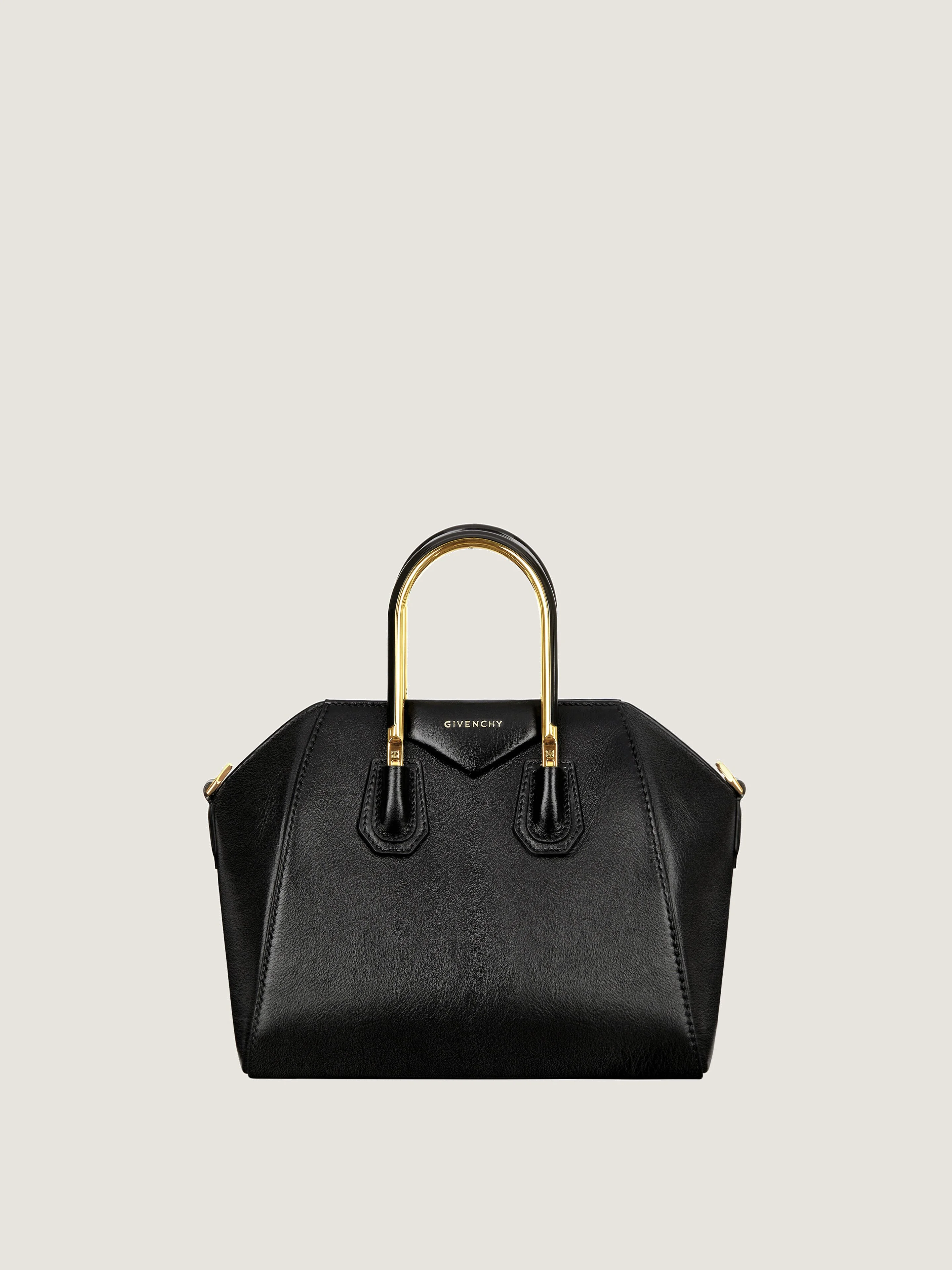 - Mini shoulder bag or crossbody bag in tumbled leather. - Antigona line. - Metal handles with 4G emblem. - Pentagonal patch with gold debossed GIVENCHY signature. - Adjustable and removable leather shoulder strap with leather details and embossed golden GIVENCHY. - Golden-finish metal details. - One zippered pocket inside. - Shoulder strap length: 19 in. Handle: 3 in.