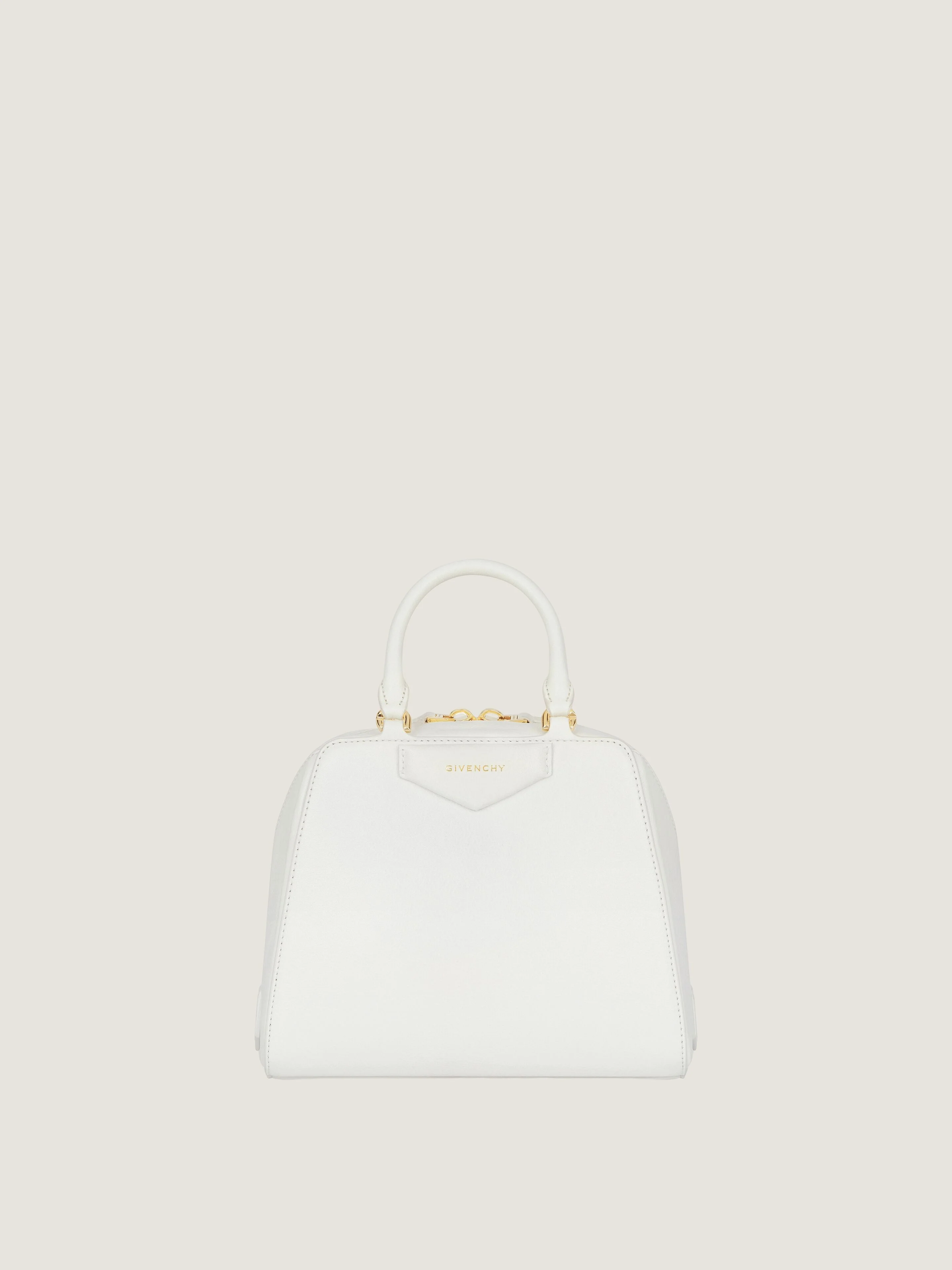 - Mini handbag or crossbody bag in shiny tumbled buffalo leather. - Antigona Cube line. - Modular cubic shape thanks to origami-style gusset construction. - Zipper closure with GIVENCHY 4G zipper pull. - Articulated leather handles with four D-Rings for the shoulder strap. - Adjustable and removable leather shoulder strap. - Pentagonal patch with golden embossed GIVENCHY signature on the front and 4G emblem on the back. - Golden-finish metal details. - One main compartment with one flat pocket inside.