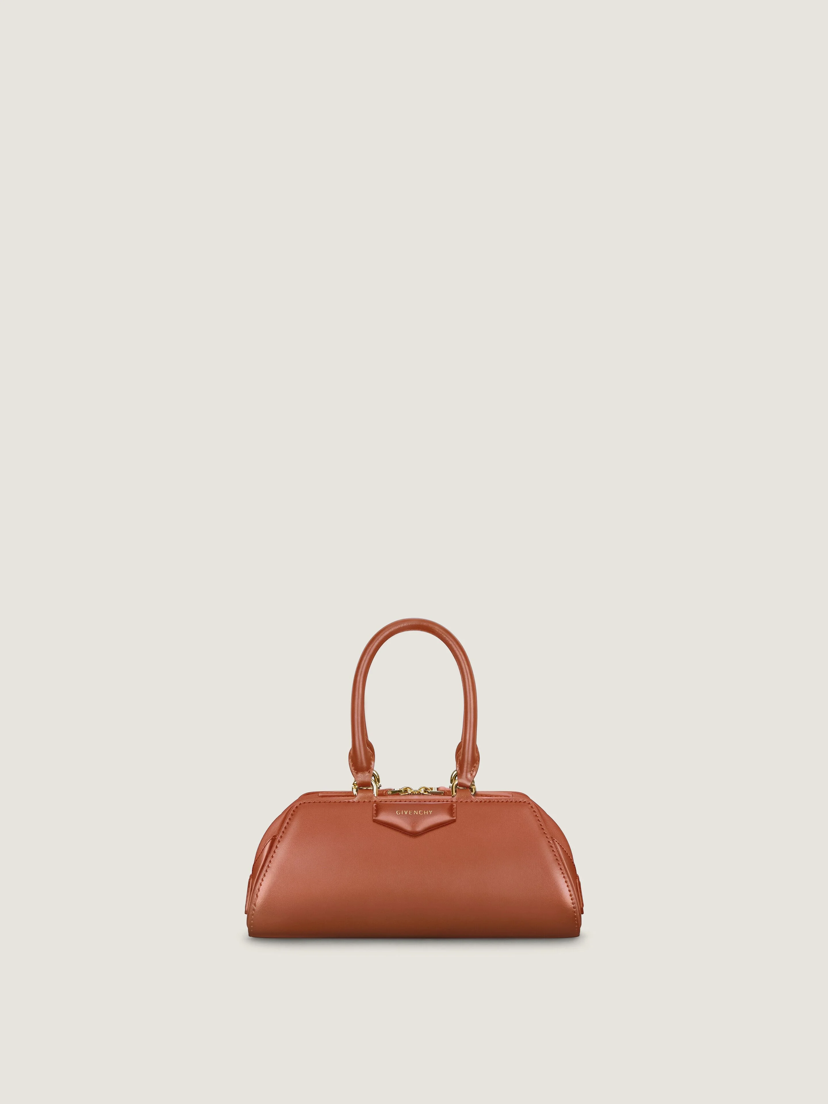 - Mini bag in Box calfskin leather and shiny grained leather. - Antigona line. - Long East-West shape with origami-style gusset construction. - Zipped closure. - Hand or crossbody carrying. - Articulated leather handles with four D-Rings for the shoulder strap. - Adjustable and removable leather shoulder strap. - Pentagonal patch with embossed GIVENCHY signature on the front. - GIVENCHY Paris patch on the inside. - Golden-finish metal details. - One main compartment.