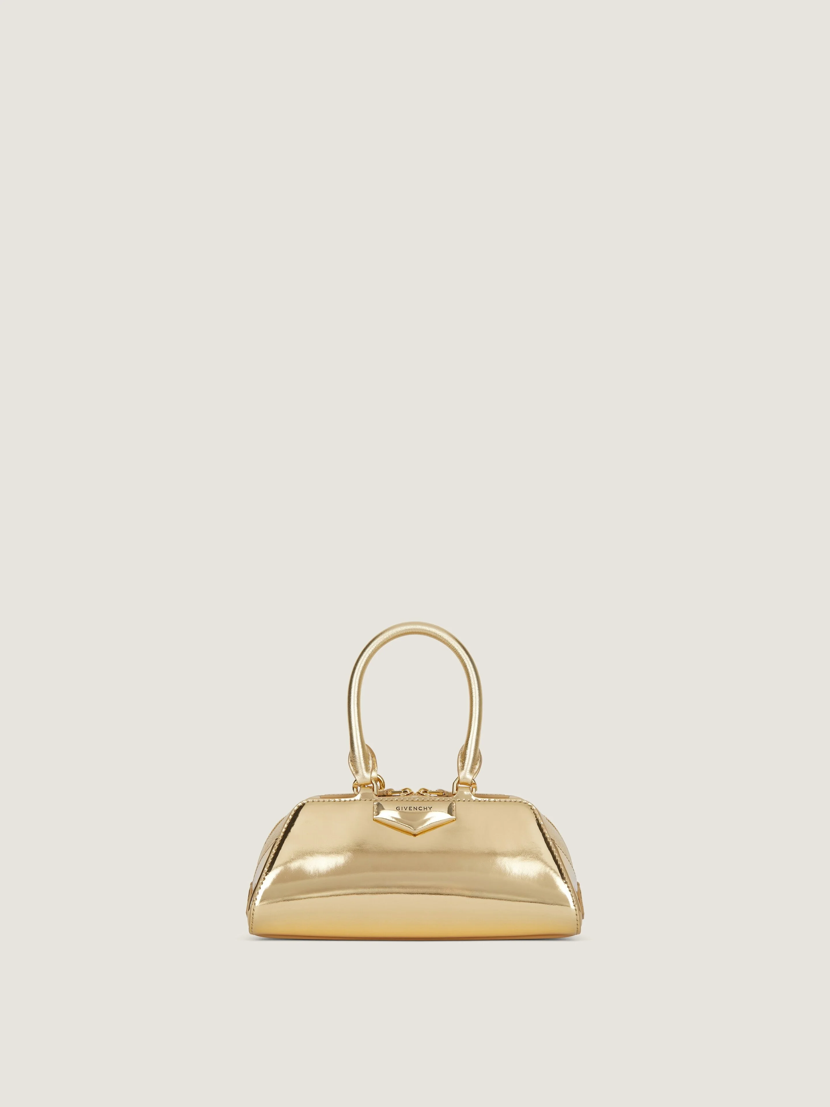 - Mini handbag or crossbody bag in laminated calfskin leather with mirror effect and shiny grained leather. - Antigona Cube line. - Long East-West shape with origami-style gusset construction. - Zipped closure. - Articulated leather handles with four D-Rings for the shoulder strap. - Adjustable and removable leather shoulder strap. - Pentagonal patch with embossed GIVENCHY signature on the front. - Golden-finish metal details. - One main compartment. - To preserve this item over time, we recommend you take the following precautions: - Keep the item away from heat sources. - Avoid any contact with greases, cosmetics or perfumes. - When the item is not in use, store it with care in its dust bag and in a cool, dry place. - Try not to let your laminated item rub against other objects as this may lead to damage or peel it.