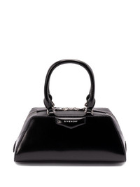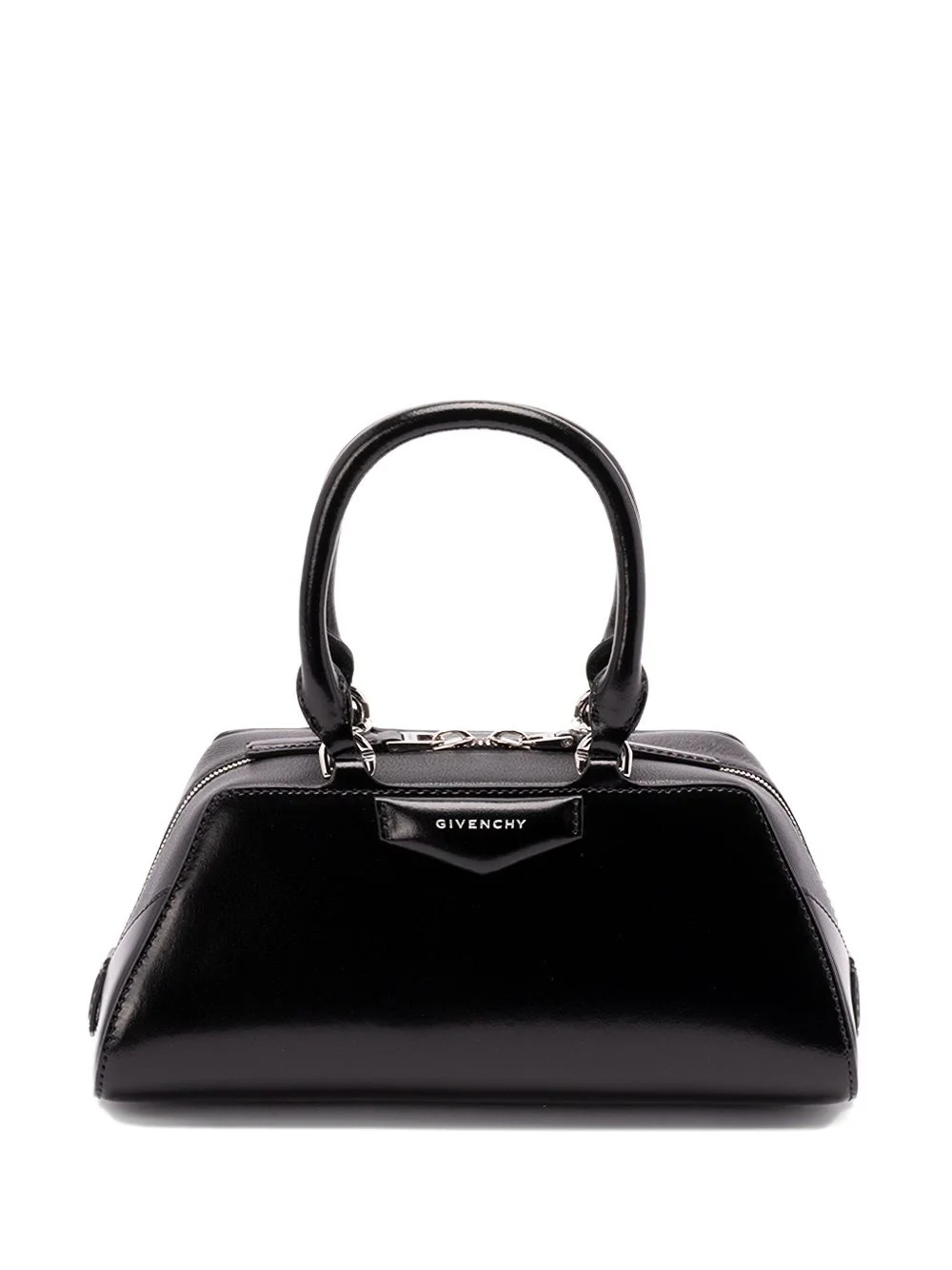 mini Antigona East-West tote bag Highlights - Black - Calf leather - Two top handles - Zip fastening - Trapezoidal shape - Detachable shoulder strap Made in Italy Composition Outer: Calf Leather 100% Lining: Cotton 90%, Polyester 10% SIZE & FIT Measurement DEPTH 4.3 in(10.9 cm) HEIGHT 4.3 in(10.9 cm) WIDTH 9.4 in(23.8 cm)