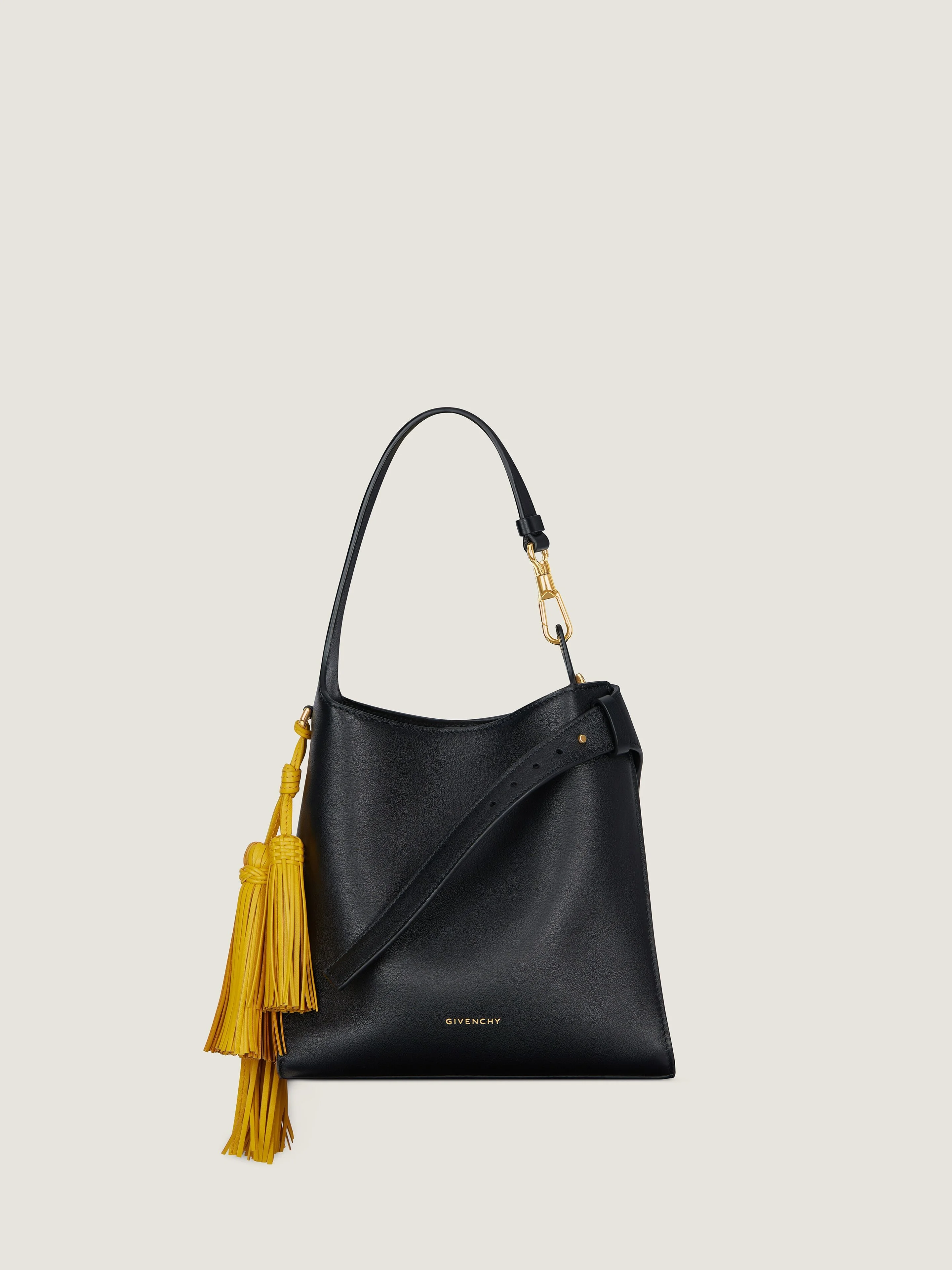 - Mini Hobo bag in luxurious smooth and soft grained shiny leather. - Belted line. - Handle for hand carrying and adjustable strap offering crossbody carrying. - GIVENCHY signature embossed on the front of the bag. - Leather belt adorning the front. - Decorative and removable leather tassel. - Golden-finish metal details. - One main compartment and one flat pocket inside. - Suede lining.