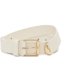 Grained calfskin belt. · Logo-engraved hardware at end · Pin-buckle fastening · W1" Supplier color: Ivory Calfskin. Made in Italy 252278F001002
