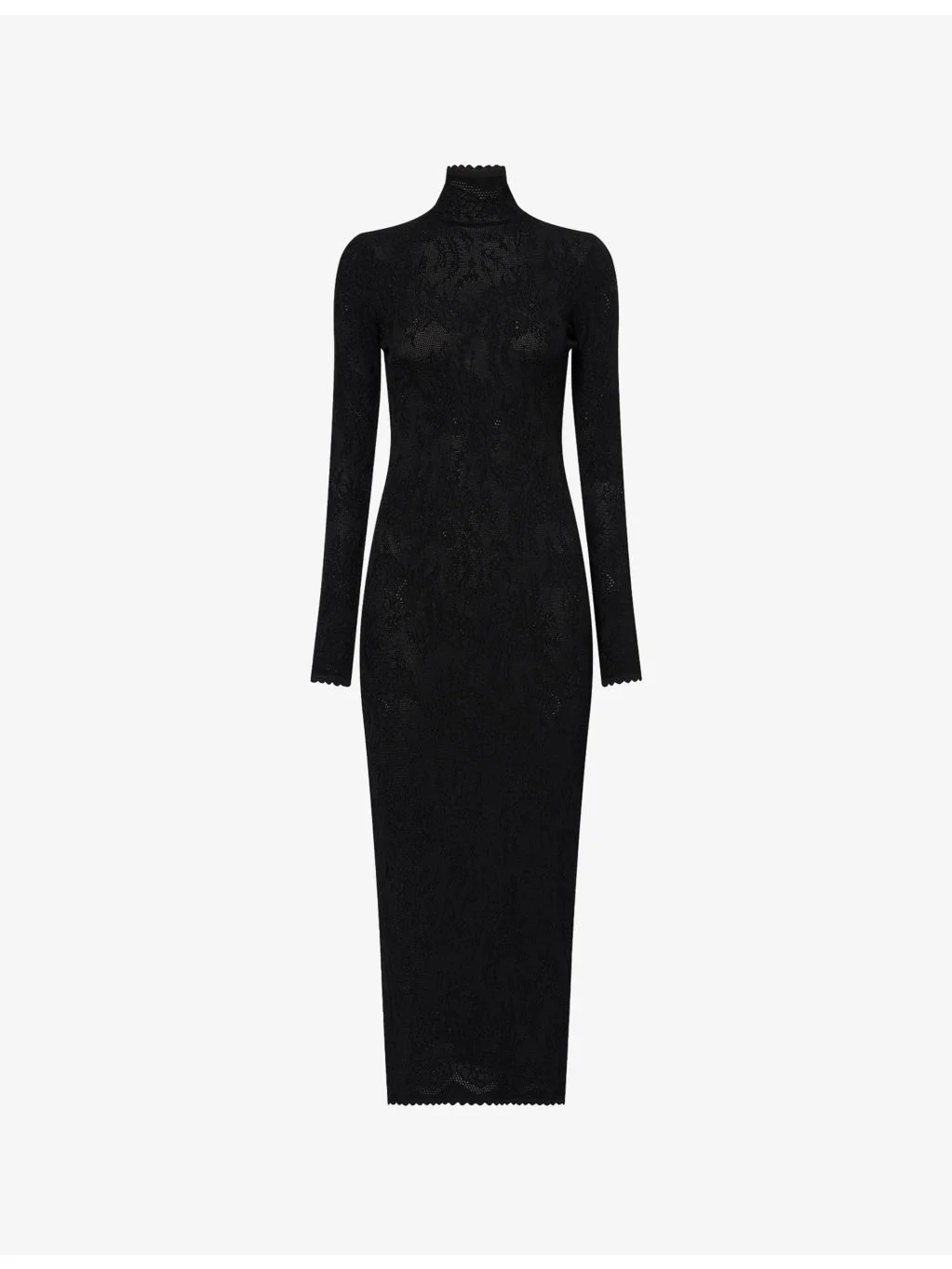 PRODUCT DETAILS - Givenchy knitted maxi dress - 85% viscose, 15% polyester - Slim fit, high-neck, long sleeves, open back, scallop trims, maxi length, all-over knitted floral lace - Dry clean - Made in Italy - True to size - Size UK 8: length 52in / 132cm - Model is 5ft 10in/1.78m and wears a size UK 8 - Midweight, stretchy Ref: R04557355
