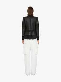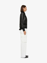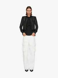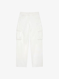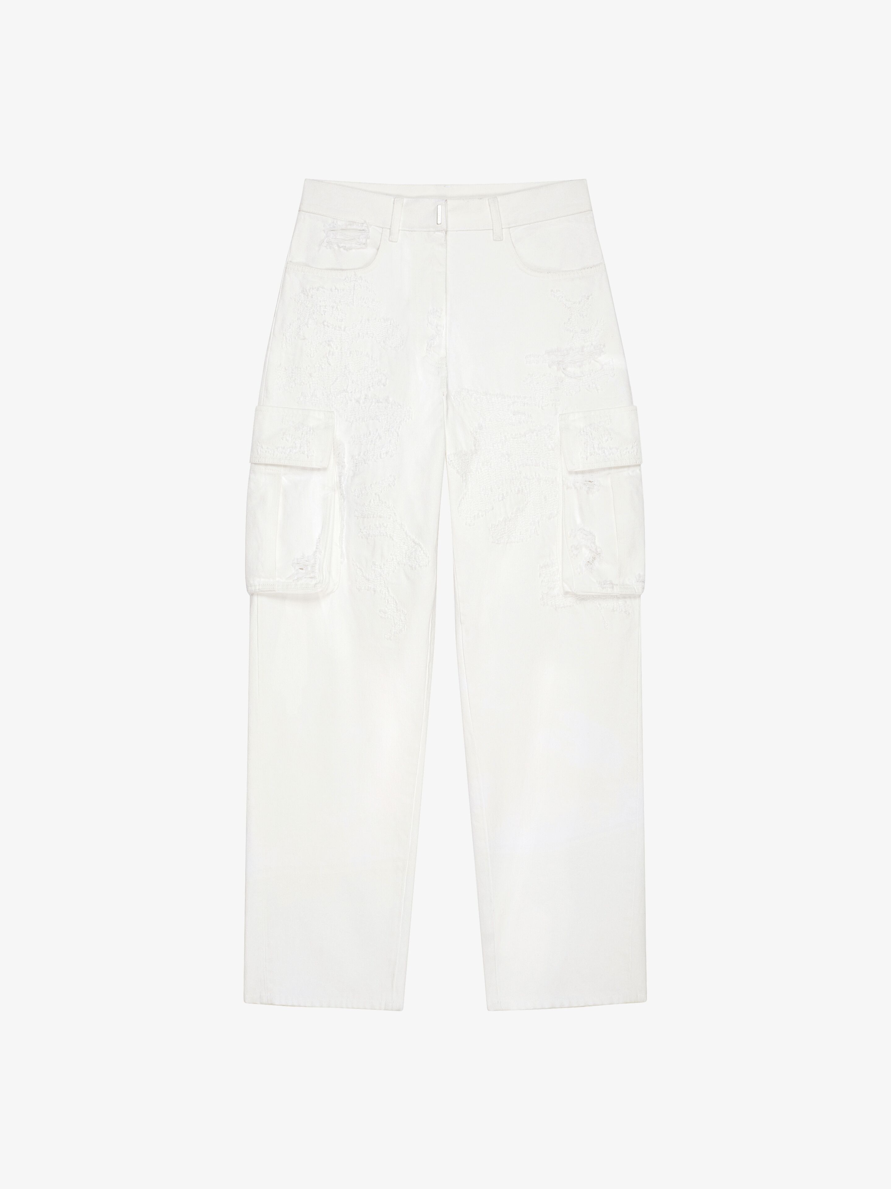 - Cargo pants in denim with rip and repair effect. - Metal GIVENCHY bar closure. - Wide legs. - Two side pockets on the front and two raised flap pockets on the legs. - Two flap pockets on the back. - 4G metal rivets on the back. - Oversized cut.