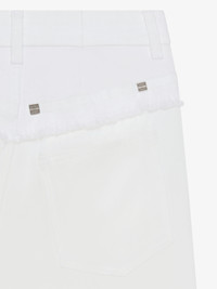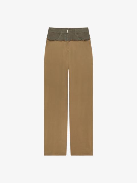 - High rise jeans with mixed denim and viscose. - Denim waist yoke and satin effect viscose bottom. - Waist with loops and zipped closure with GIVENCHY metal bar. - Two front pockets. - Two pockets and one hidden pocket on back. - 4G metal rivets in the back. - Oversized fit.