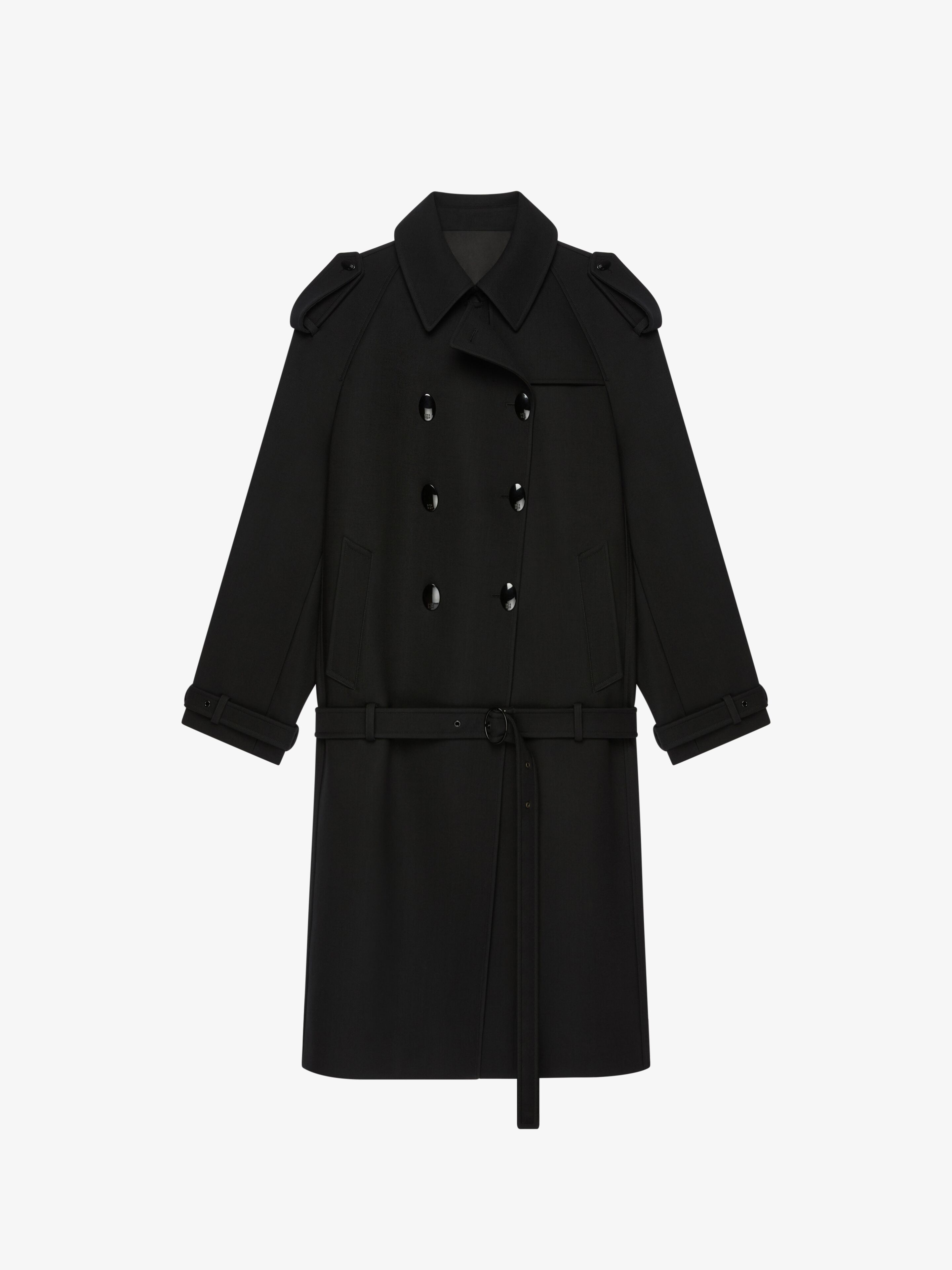 - Trench-coat in wool. - Classic collar. - Button closure. - 4G engraved oval buttons. - Adjustable belt. - Tightening tab on cuffs. - Oversized fit with volume in the back. - Model measures 5.8 Feet and wears a size 36.