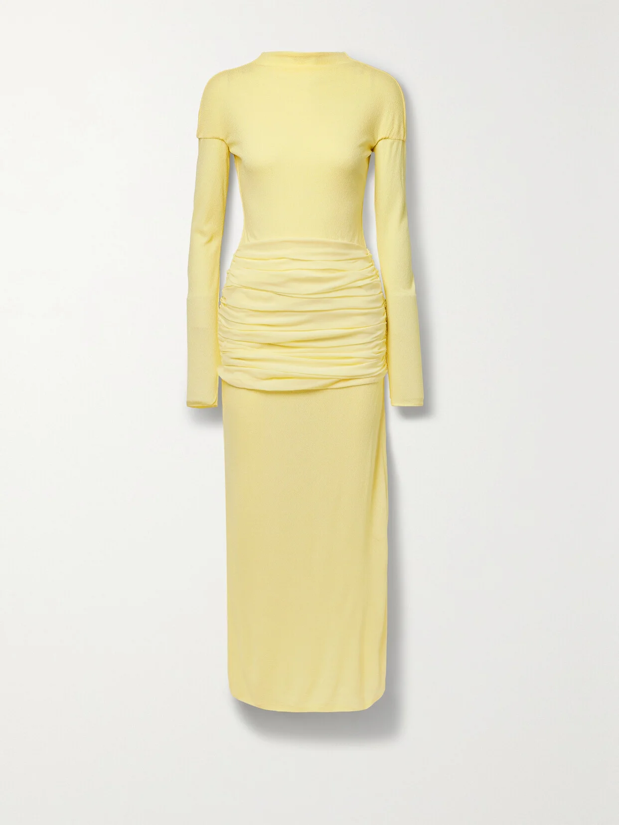 Givenchy's gown debuted on the Fall '23 runway, which delved into the label's archive, updating pieces with modern details. Made from pastel-yellow crepe, this style has long, semi-sheer sleeves and ruching at the center to enhance the slim fit. The attached train is sure to sway with your every move.