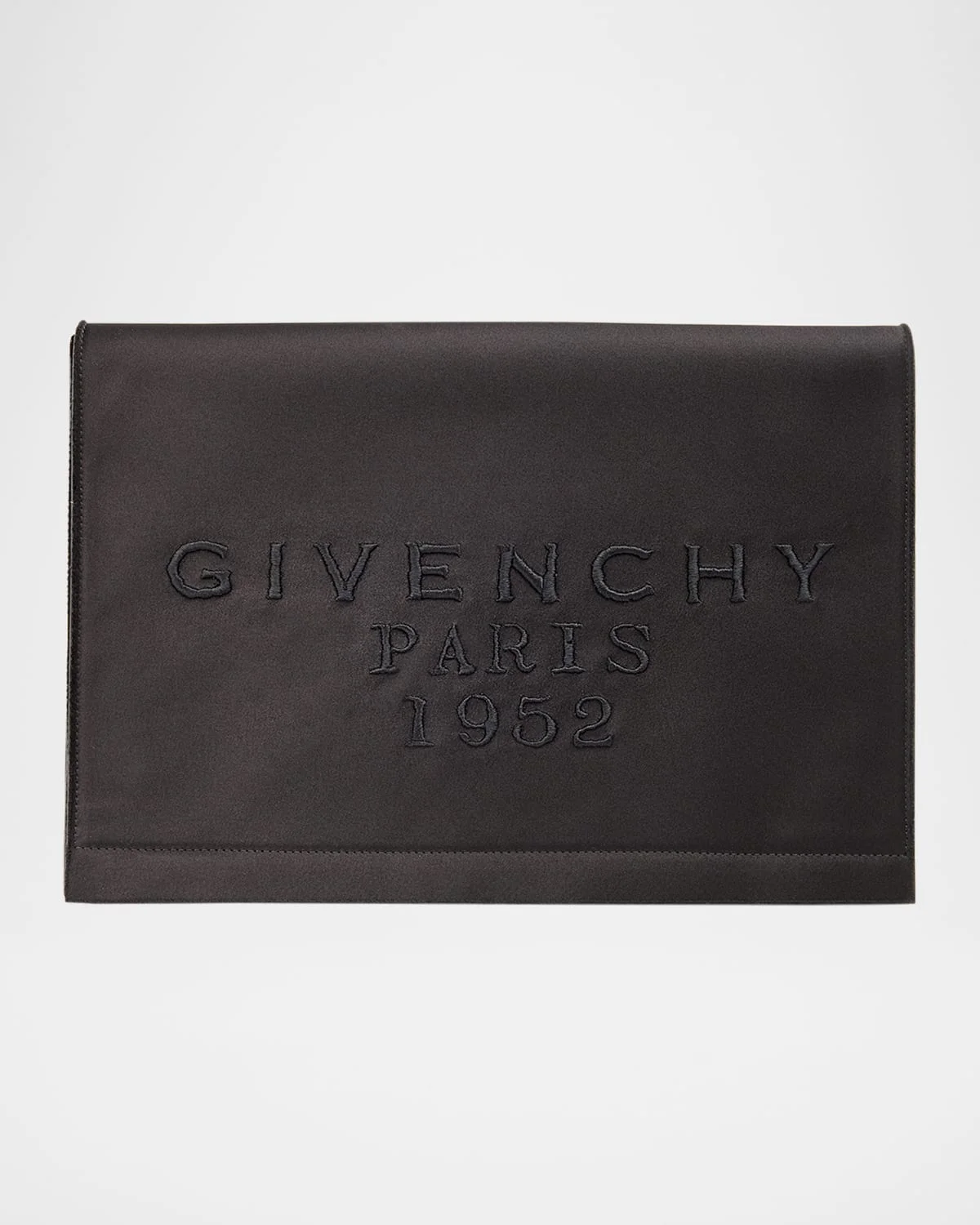 Givenchy pochette in silk with GIVENCHY Paris 1952 embroidery on the front Flap top Three main compartments Suede lining Approx. 14.2"H x 9.6"W x 1"D Made in Italy