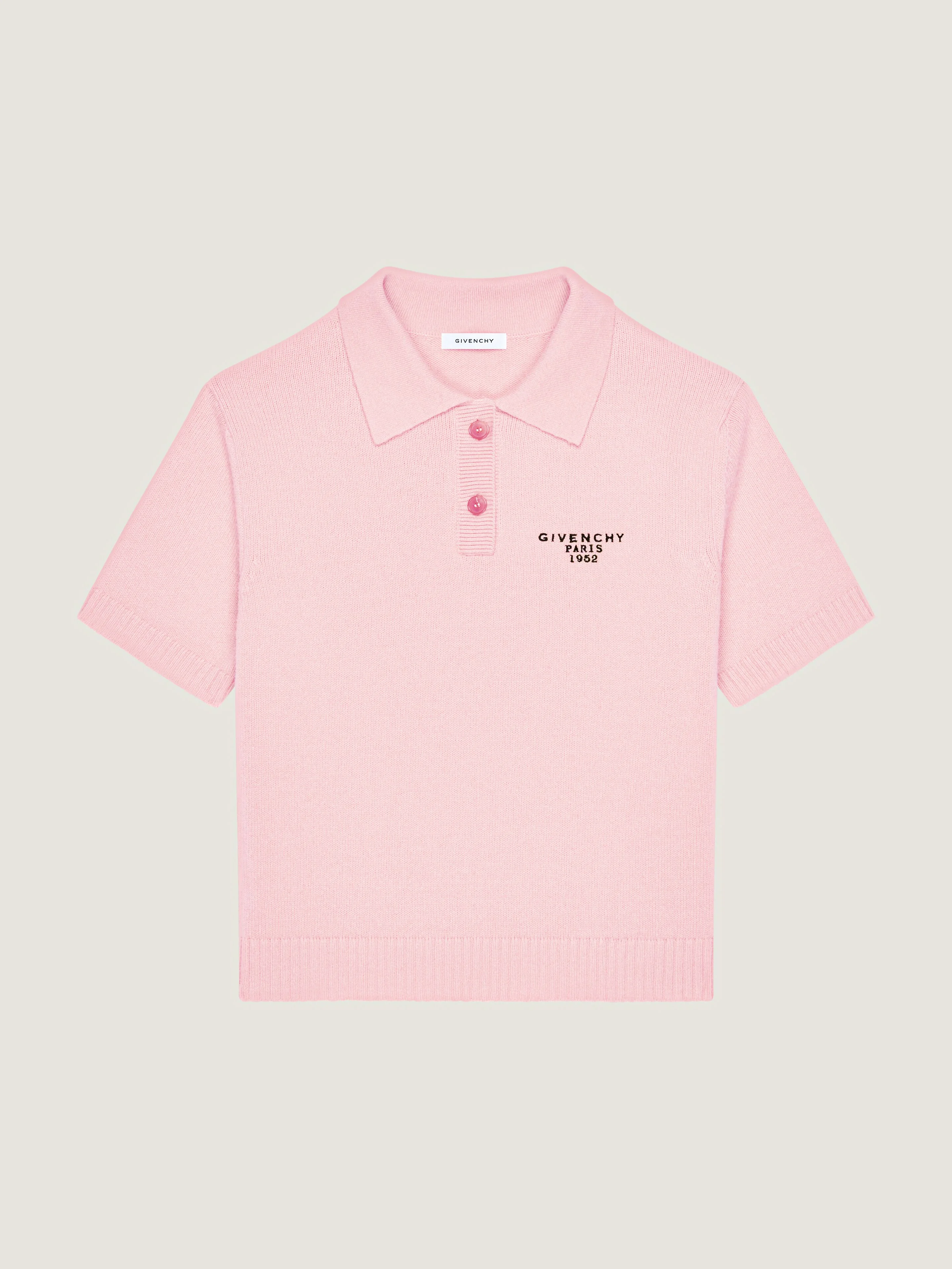 - Short-sleeved polo shirt in wool and cashmere. - Polo button-down collar. - GIVENCHY Paris 1952 signature embroidered on the chest. - Ribbed hem and bottom sleeves. - Model measures 5.8 Feet and wears a size XS.