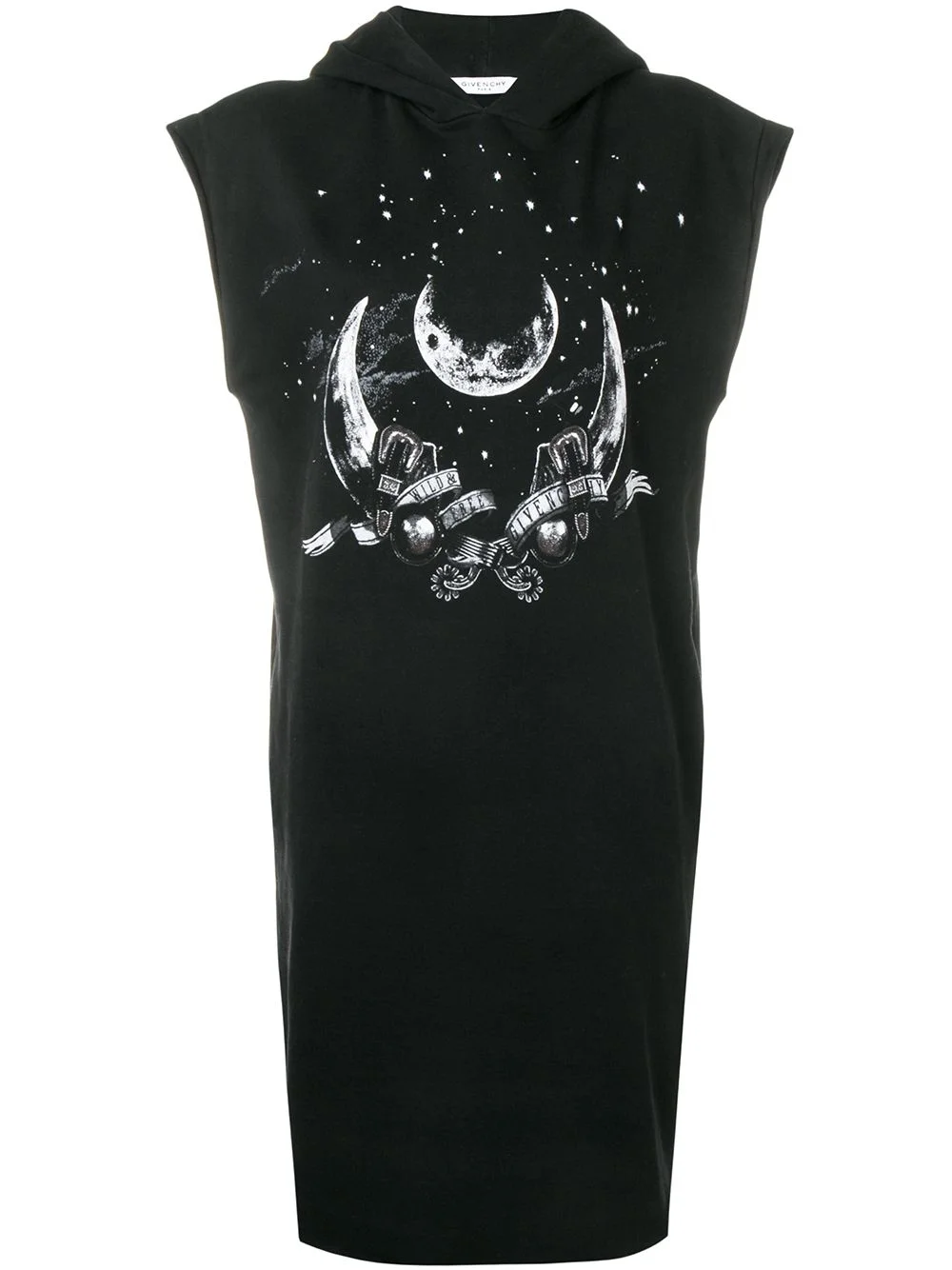 printed T-shirt dress Infused with the label’s signature dark romanticism and urban styling, French fashion house Givenchy was originally founded in 1952 by acclaimed couturier Hubert de Givenchy. This black cotton printed T-shirt dress from Givenchy features a hood, a sleeveless design and a short length. Imported Composition Cotton 100% SIZE & FIT Model measurements Height 5 ft 10 in(1.77 m) Bust/Chest 33.85 in(86 cm) Hips 35.43 in(90 cm) Waist 25.59 in(65 cm) Washing instructions Machine Wash