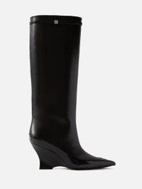 Givenchy's sculpted wedge and pointed toe take inspiration from the shape and shade of a raven. This style brings the designer's Parisian elegance with its sleek knee-high shaft and a 4G logo embellishment at the top of each boot. Details 100% calf leather Heel height: 8 cm Made in Italy Professional clean only Item # 1-163431 Designer