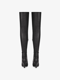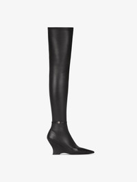- Over-the-knee boots in stretch nappa leather and embossed ayers. - Raven line. - Double décolleté effect. - Thin embossed ayers strap around the ankle with silvery-finish 4G metal piece. - Pointy toes. - Hidden zipper on the inside of the foot. - Sharp wedge heels. - Heel height : 3.1 in.