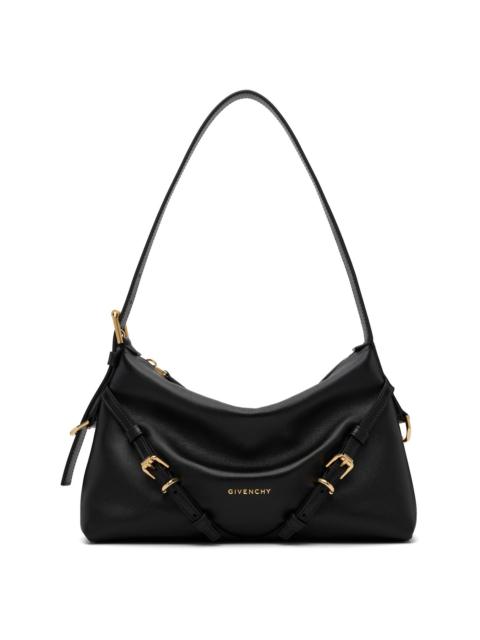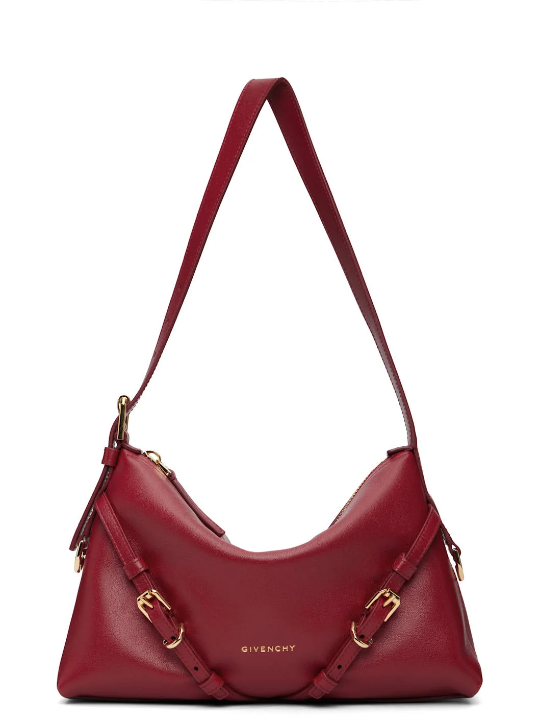 Grained calfskin shoulder bag. · Adjustable shoulder strap · Logo stamp and pin-buckle straps at face · D-ring at sides · Zip closure · Canvas lining · Gold-tone hardware · H7.75” x W11.25” x D2” Supplier color: Dark Red 100% calfskin. Made in Italy 252278F048009