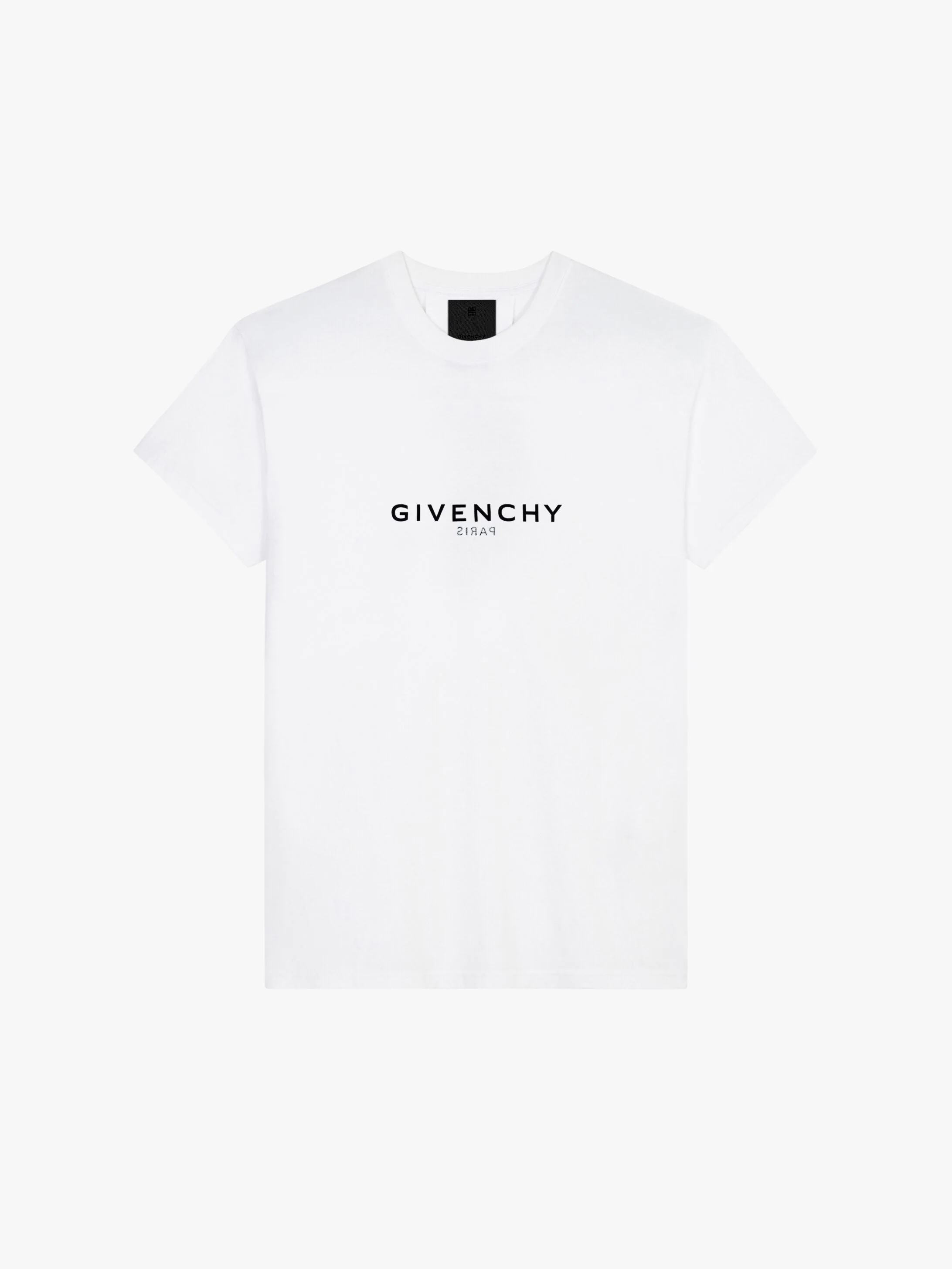 - Short-sleeved t-shirt in cotton. - Crew neck. - Reverse-effect GIVENCHY Paris signature printed on the front and back. - Small 4G emblem printed on the lower back. - Slim fit.