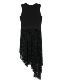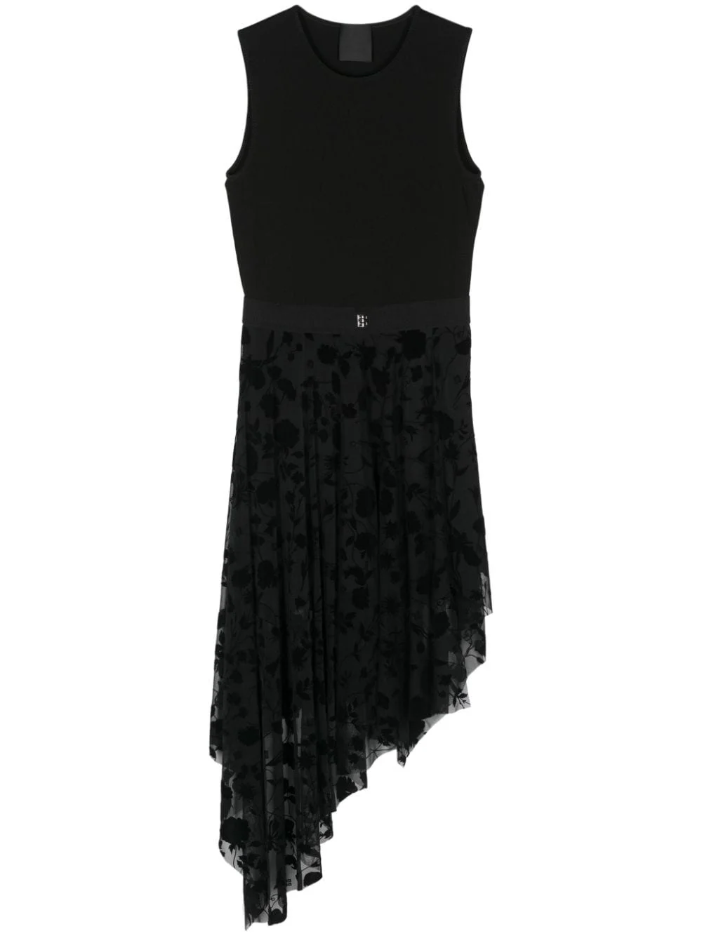 ribbed-knit asymmetric dress Highlights - Black - Ribbed knit - Round neck - Sleeveless - Elasticated waistband with signature 4g motif - Mesh skirt with floral detail - Asymmetric hem - Partial lining - Slip-on style Made in Italy Composition Lining: Acetate 73%, Silk 27% Outer: Polyamide 82%, Elastane 18% Washing instructions Dry Clean Only