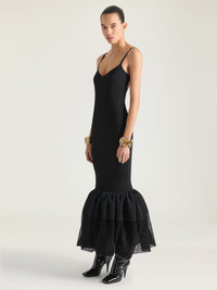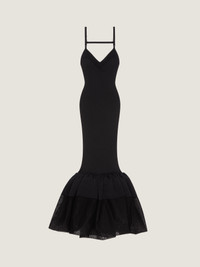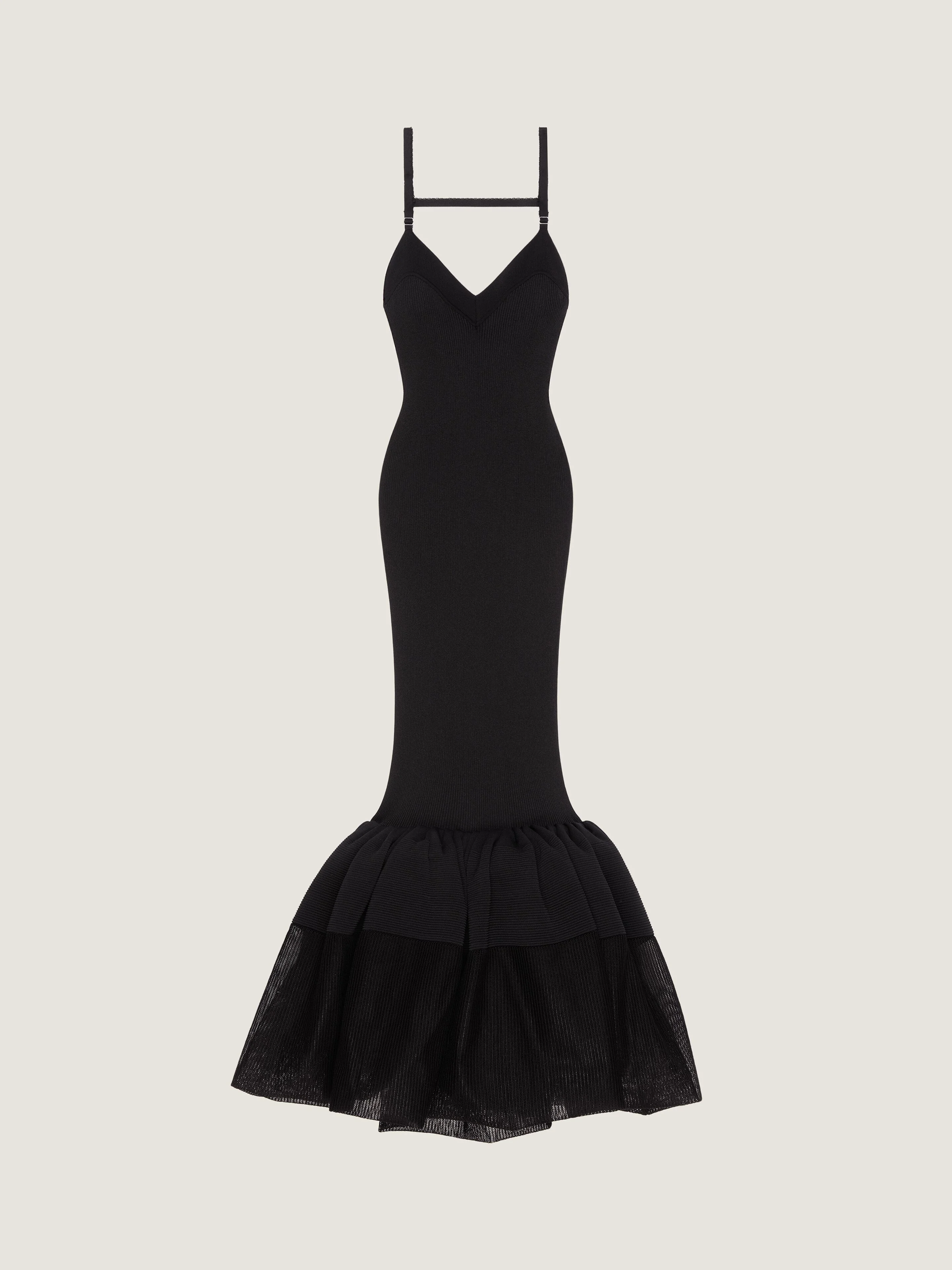 - Long knitted dress in fine rib. - V neckline. - Adjustable straps. - Open back. - Gathered knit ruffle detailing at the hem. - Model measures 5.8 Feet and wears a size XS.