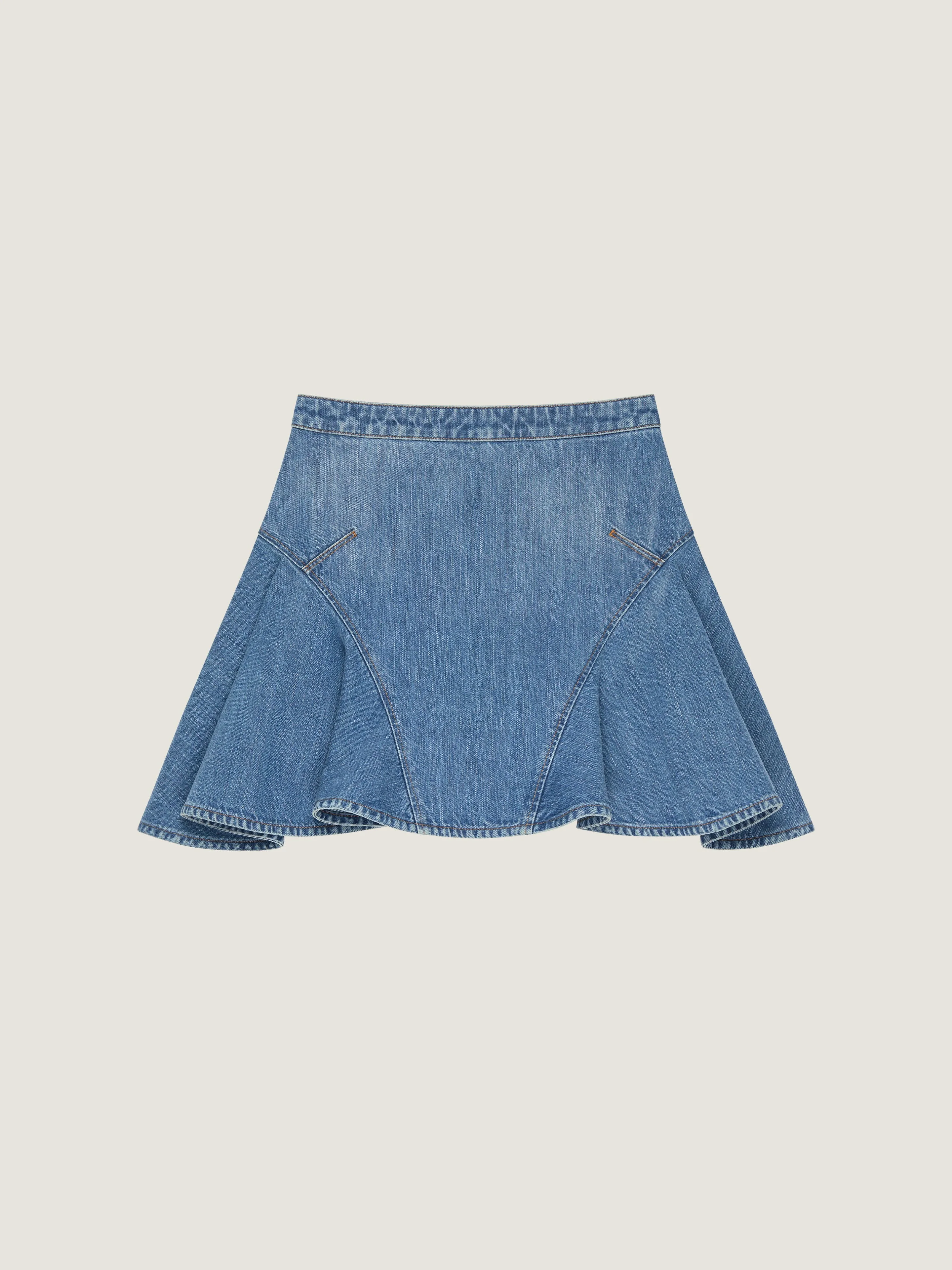 - Mini skirt in washed denim. - Ruffles with volume. - Invisible zipped closure on the back.