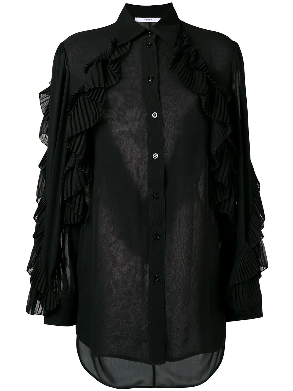 ruffled style transparent blouse Givenchy is an international luxury brand, known worldwide for its Haute Couture and ready-to-wear collections. His sophisticated manner and very feminine style was injected into this spring collection. This black cotton blend ruffled style transparent blouse from Givenchy featuring long sleeves and a button fastening. Made in Italy Composition Cotton 77%, Polyester 23% SIZE & FIT Model measurements Height 5 ft 10 in(1.78 m) Bust/Chest 33.07 in(84 cm) Hips 36.61 in(93 cm) Waist 24.8 in(63 cm) Washing instructions Dry Clean Only