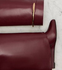 Step out in style with the Shark knee-high boots by Givenchy. Made in Italy from burgundy-hued leather, the pair features the distinctive wrap-style silhouette with 95mm wedge heels and gold-tone detailing. Product Details - Upper: calf leather - Lining: leather - Sole: leather insole, rubber sole - Color: burgundy - Toe shape: almond toe - Made in Italy - Includes: dust bag, shoe box - Designer color name: Burgundy - Item color: burgundy - Hardware color: gold - Item number: P01128251 Size & Fit - True to size - European sizes - 9,5cm-3.5" wedge heel - 37cm-14.5" shaft height (size EU 38) - 41cm-16" shaft width (size EU 38) - shaft width measured on largest part of boot