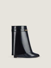- Ankle boots in calfskin leather. - Shark line. - Metal pinch with GIVENCHY engraved. - Golden-finish metal details. - Pointy toe. - Covered wedge heels. - Wrapped upper for support and fluid motion. - Heel height: 3.7 in.