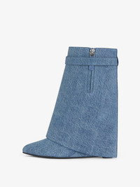 - Slip-on ankle boots in denim. - Shark Lock line. - Denim band featuring GIVENCHY metal clasp and silvery-finish 4G padlock on the right side and silvery-finish GIVENCHY padlock on the left one. - Almond-toe boots. - Covered wedge heels. - Hidden zipper with leather zipper pull on the inside of the foot. - Heel height: 3.5 in.