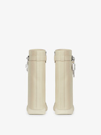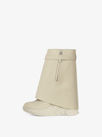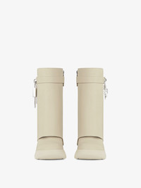 - Slip-on ankle boots in grained calfskin leather. - Shark Lock Biker line. - Leather band featuring GIVENCHY metal clasp and silvery-finish 4G padlock on the right side and silvery-finish GIVENCHY padlock on the left one. - Thick graphic rubber sole. - Hidden zipper with leather zipper pull on the inside of the foot. - GIVENCHY signature debossed on the back of the heel. - GIVENCHY 4G signature debossed on the leather insole. - Heel height: 4.7 in. Platform height: 1.4 in.