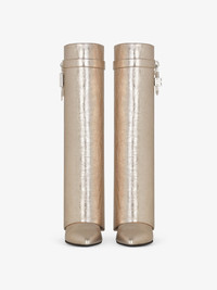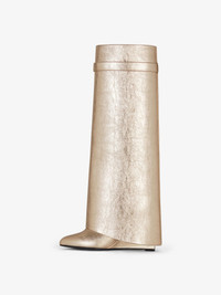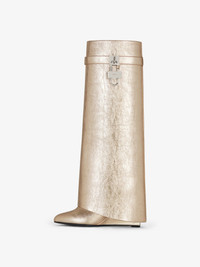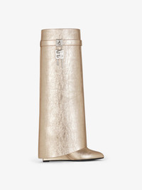 - Slip-on high boots in laminated calfskin leather. - Shark Lock line. - Laminated leather band featuring GIVENCHY metal clasp and silvery-finish 4G padlock on the right side and silvery-finish GIVENCHY padlock on the left one. - Almond-toe boots. - Covered wedge heels. - Heel height: 3.5 in.