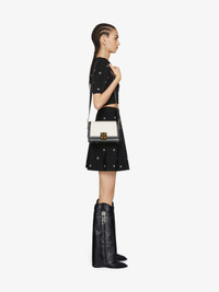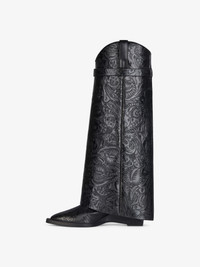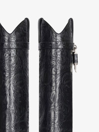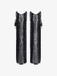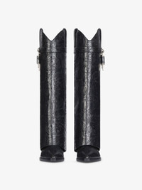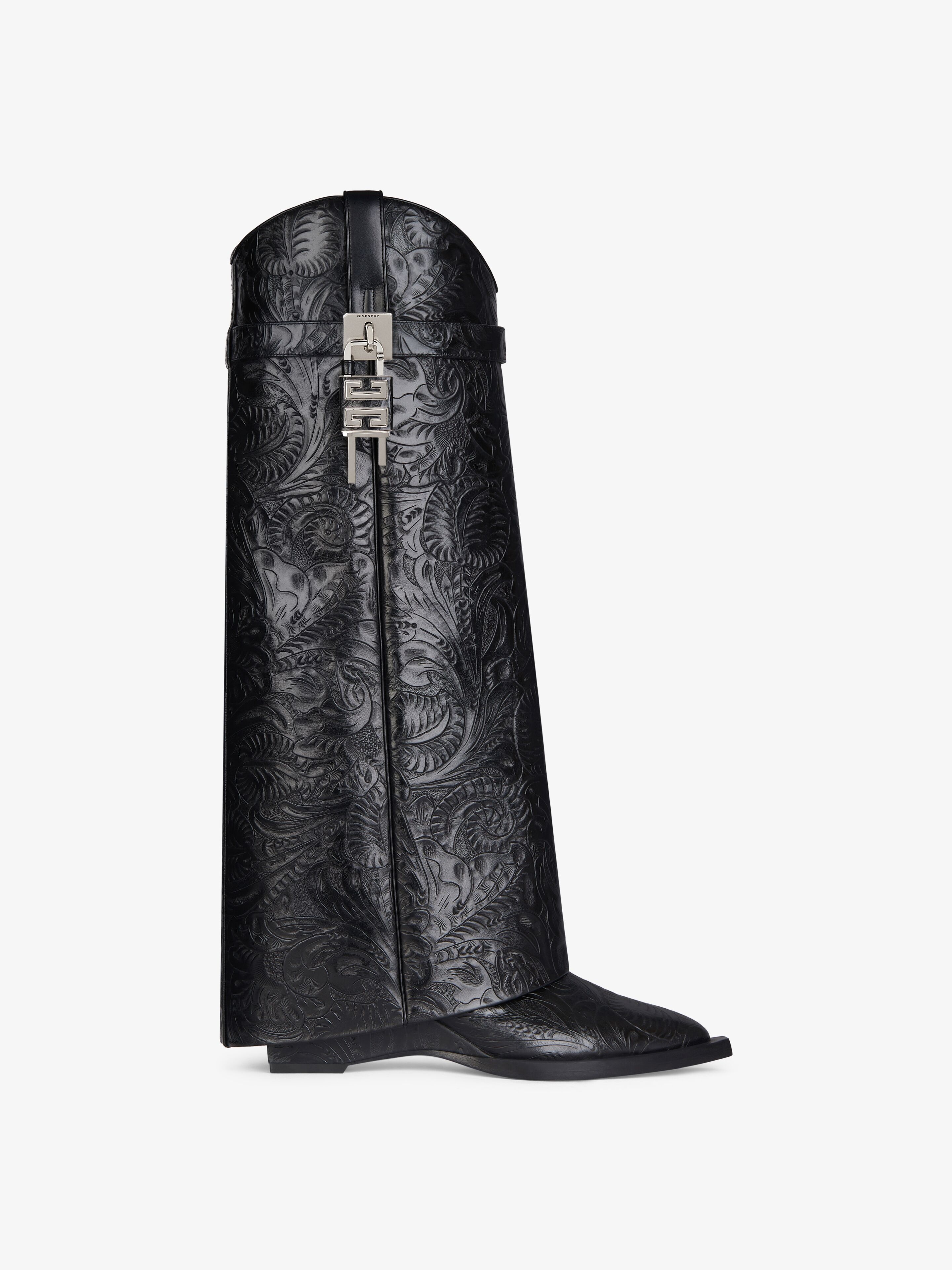 - Slip-on boots in leather with western pattern. - Shark Lock line. - Leather band featuring GIVENCHY metal clasp and silvery-finish leather covered 4G padlocks. - Almond-toe boots with apparent stitching. - Covered wedge heels. - Heel height: 2.4 in.