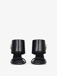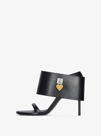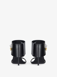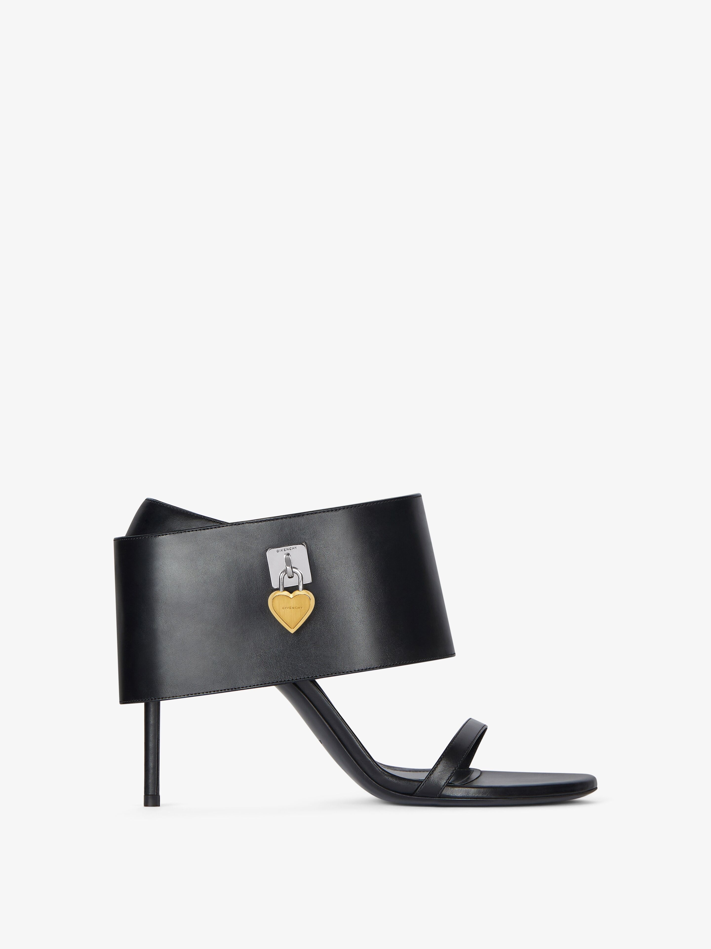 - Sandals in calfskin leather. - Shark Lock line. - Large ankle strap covering the heel. - GIVENCHY metal clasps. - Fixed heart padlock with GIVENCHY engraved on the right boot. - Fixed heart padlock with monogram 72 engraved on the left boot. - GIVENCHY signature debossed on the leather insole. - Golden and silvery-finish metal details. - Stiletto heel. - Heel height: 3.7 in.