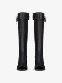 - High sandal boots in stretch nappa leather. - Shark Lock Stiletto line. - Hidden zipper and elastic strap with snaps on the inside of the foot. - Leather band with GIVENCHY metal clasp and leather-covered 4G padlock. - GIVENCHY signature debossed on the leather insole. - Silvery-finish metal details. - Open-toe. - Covered wedge heels. - Heel height: 3.8 in.