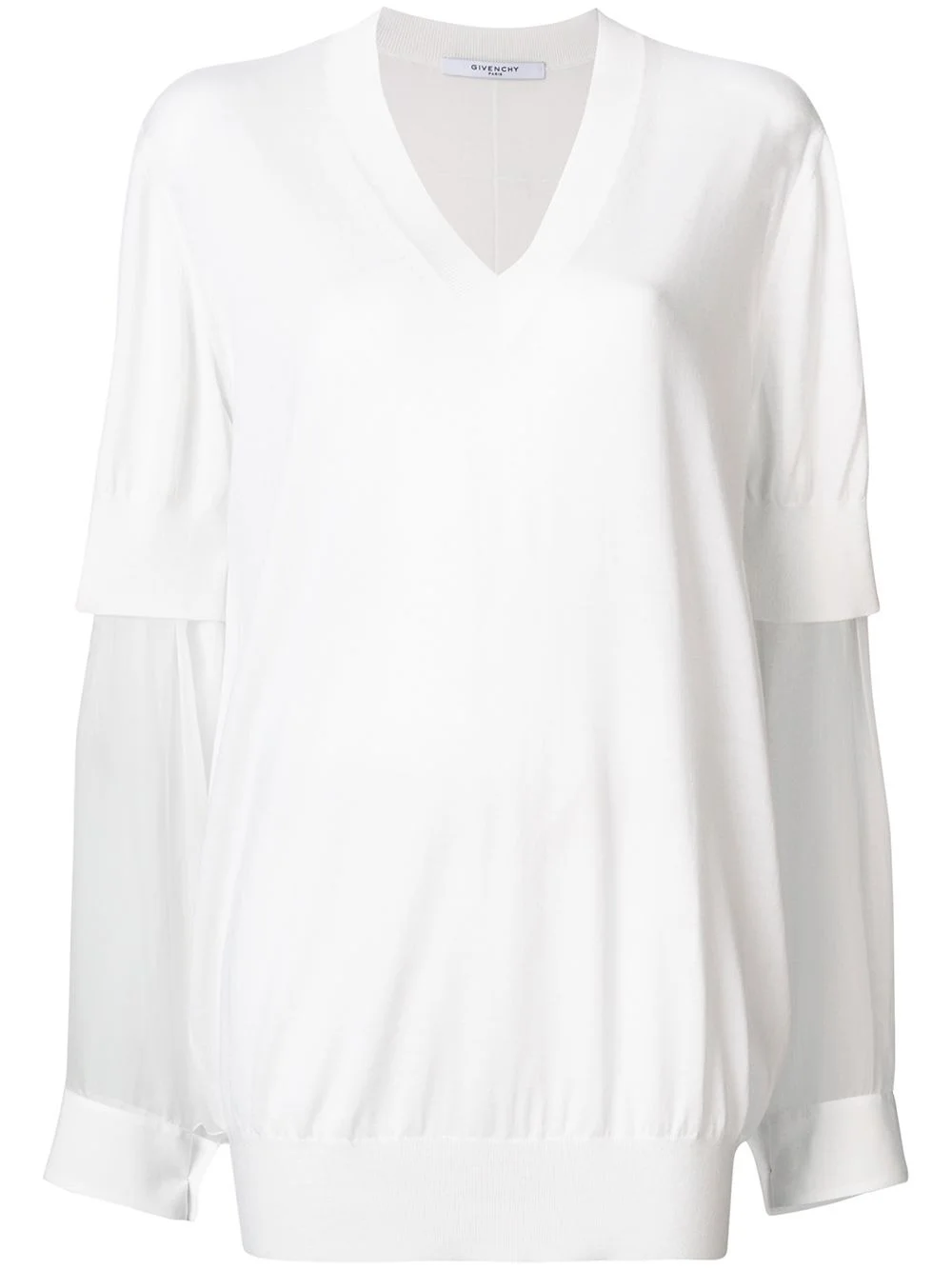 sheer sleeve sweater Givenchy's urban style and dark romanticism provides tough-luxe detailing and an unconventional elegance. This layered knit is elegant to the end, elevating the staple sweater with its organza inserts to the sleeve. The top layer of this unique piece features a a knitted style sweater with a ribbed v-neck and half sleeves with ribbed cuffs, which extend to a full length with long sheer silk inserts, finished with a ribbed hem and cuffs, true to the traditional style. Made in Italy Composition Wool 70%, Silk 30% SIZE & FIT Model measurements Height 5 ft 10 in(1.79 m) Bust/Chest 32.67 in(83 cm) Hips 33.46 in(85 cm) Waist 24.01 in(61 cm) Washing instructions Dry Clean Only
