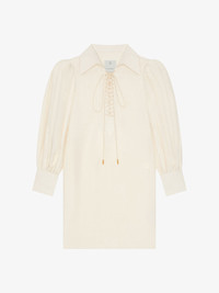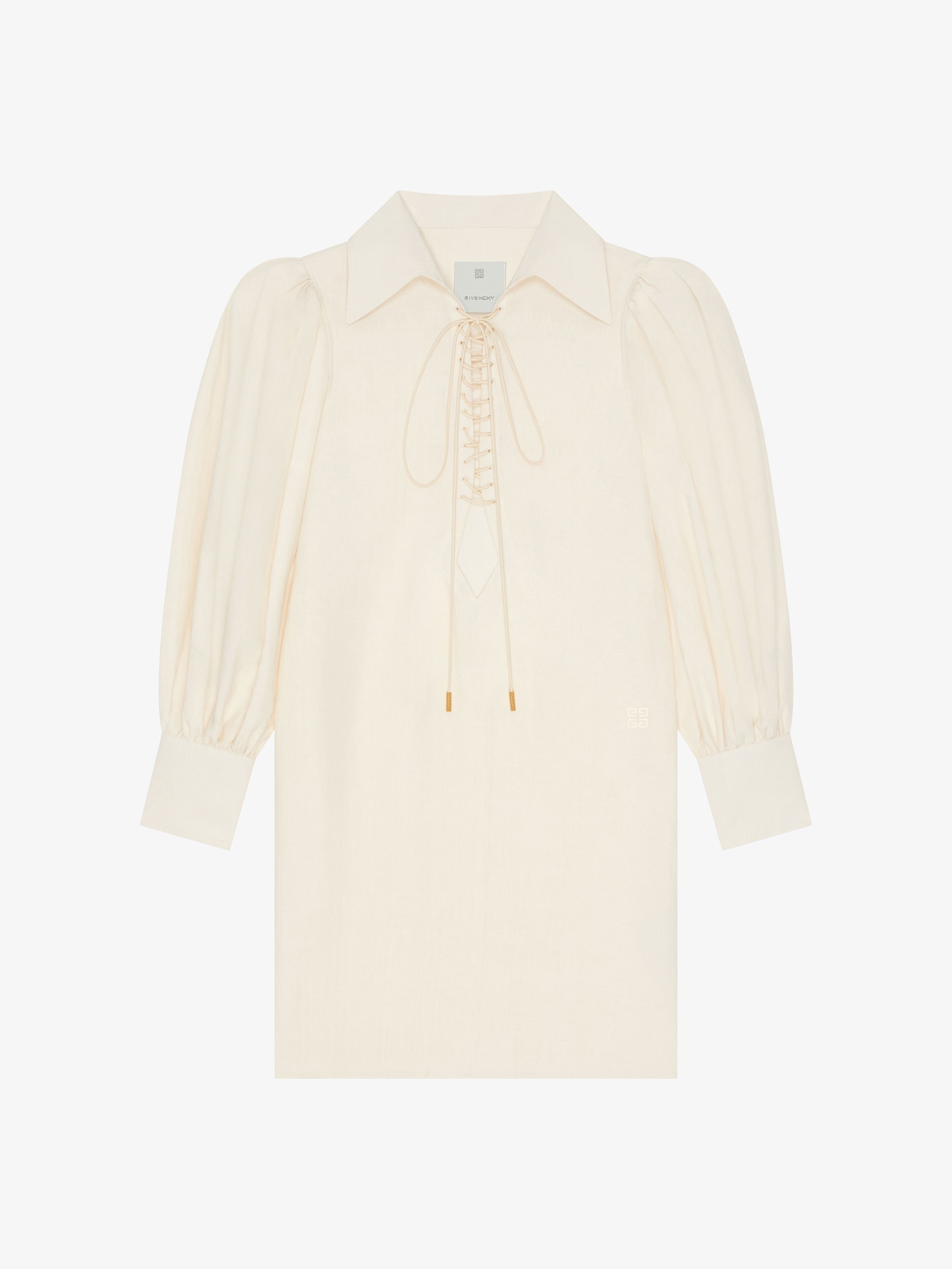 - Inspired by Hubert de Givenchy's 1970s style, the collection is adorned with laced details that evoke a subtle sensuality and bold femininity. - Short dress with long sleeves in linen. - Shirt collar. - Front laces with GIVENCHY engraved metal tips. - Small 4G emblem embroidered on the front. - Balloon sleeves. - Buttoned cuffs. - Model measures 5.8 Feet and wears a size 36.