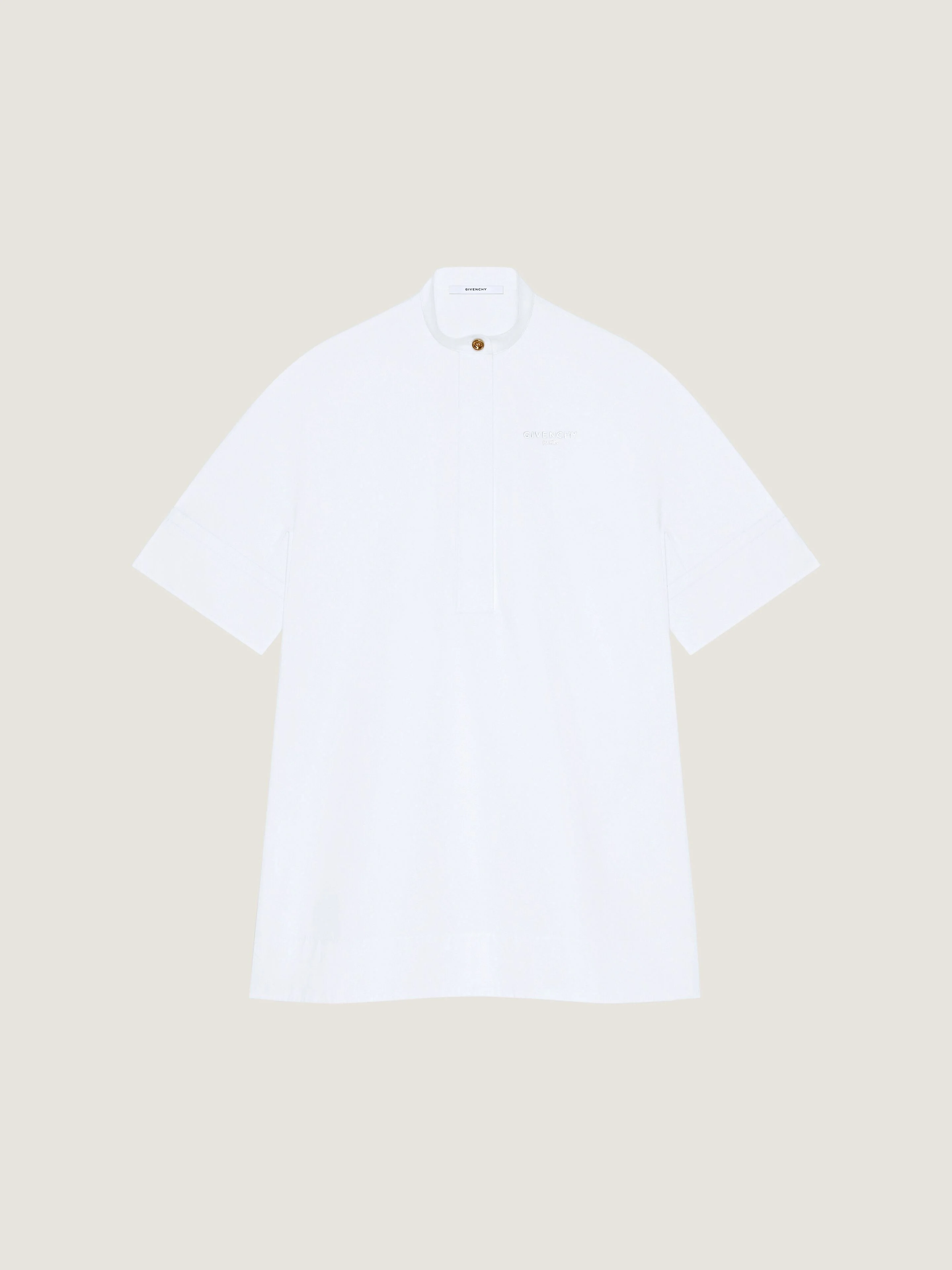 - Short shirt dress with short-sleeves in cotton poplin. - Mao collar. - GIVENCHY-engraved golden button. - Small GIVENCHY Paris signature embroidered on the chest. - Hidden button tab on the front. - Model measures 5.8 Feet and wears a size 36.