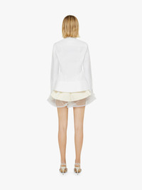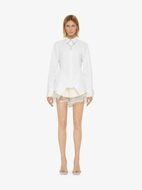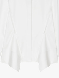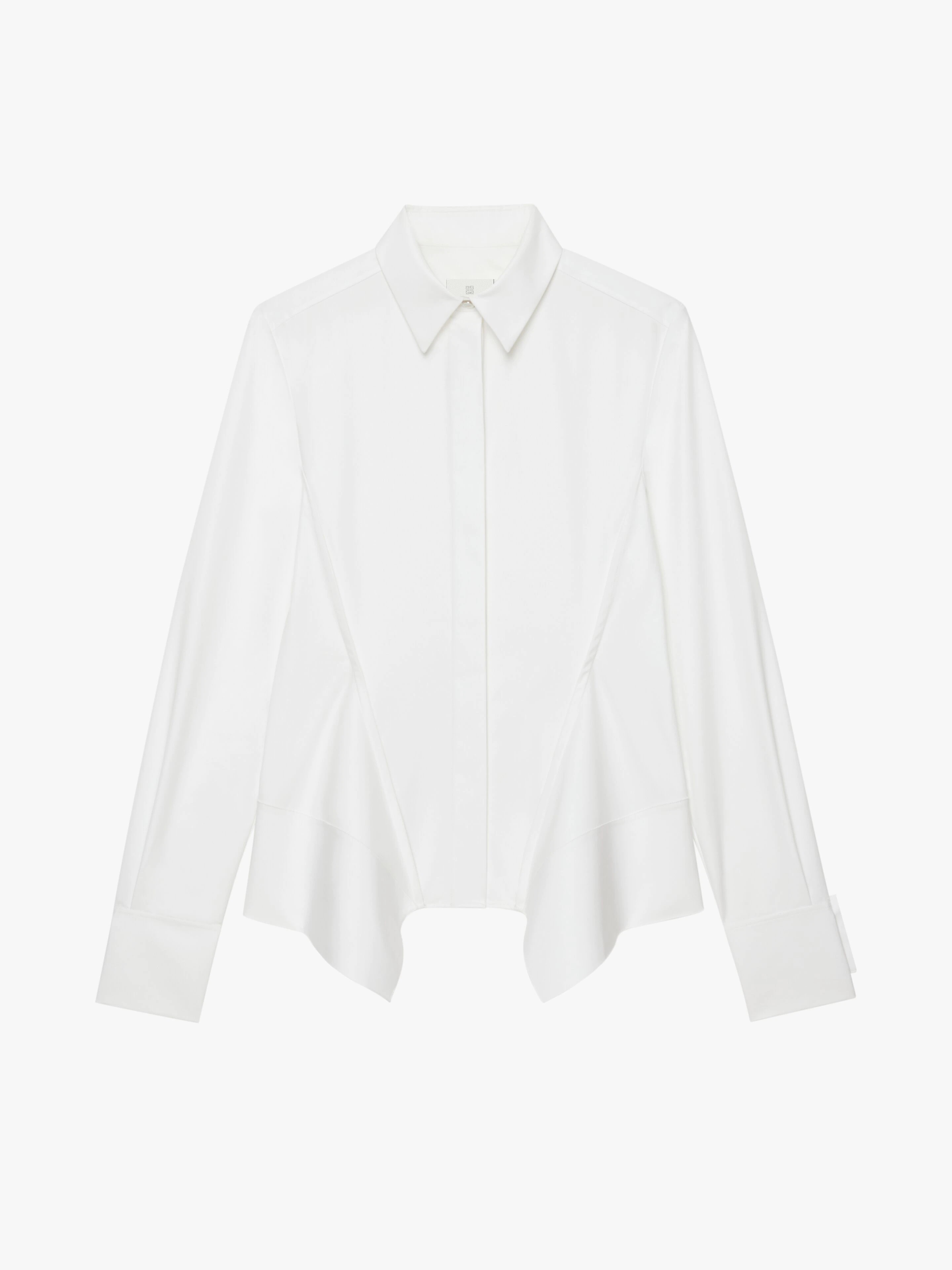- Peplum shirt in cotton poplin. - Color: white. - Square inset on one cuff. - Raw-edged hem. - Hidden button tab. - Tailored and flared graphic cut.