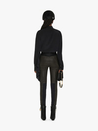 - Shirt in loose-fitting crepe de chine. - Color: black. - Black metal ring on one side and laser-perforated bandana motif knotted scarf. - Hidden button tab. - Comfortable straight-cut.